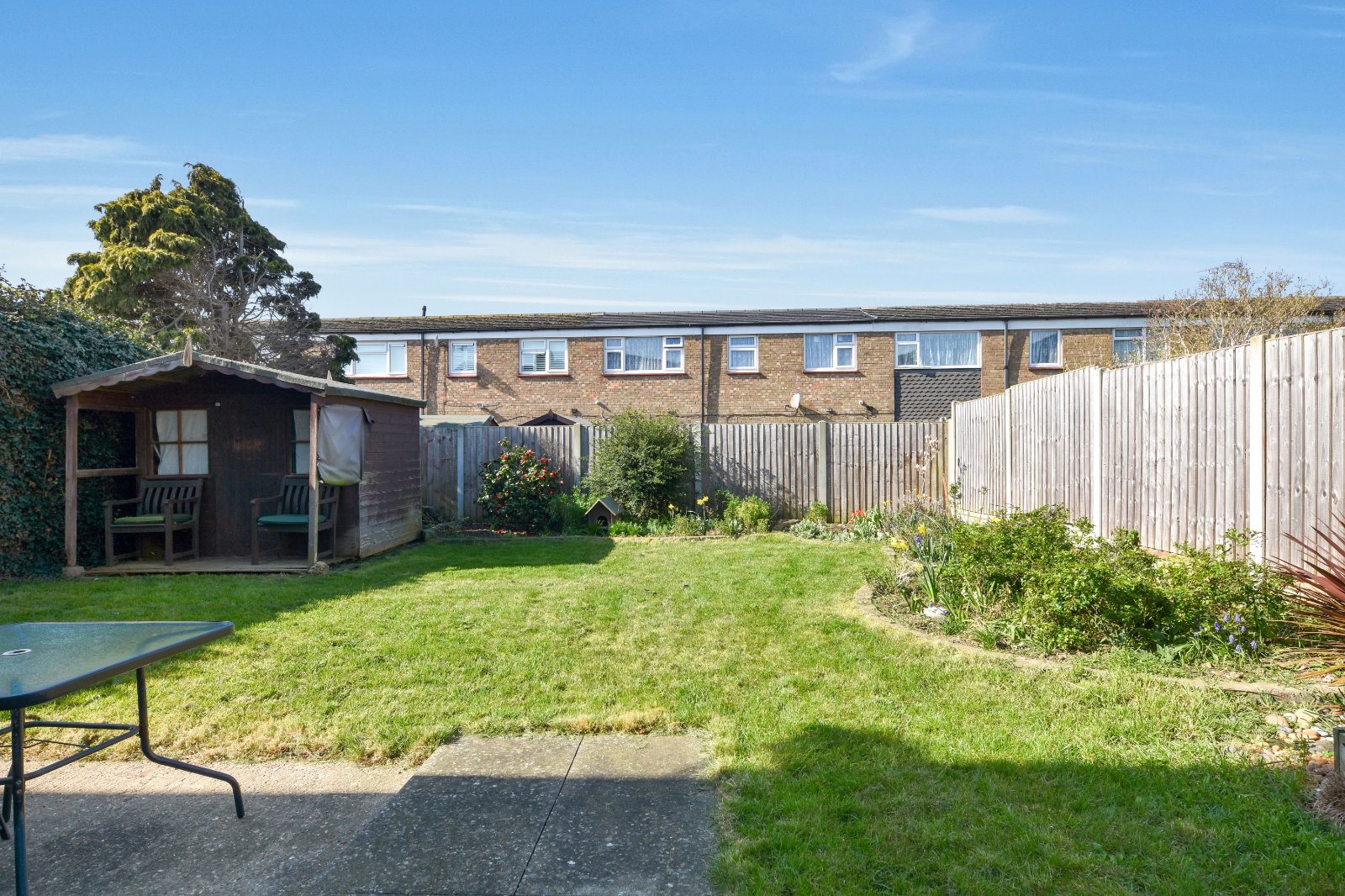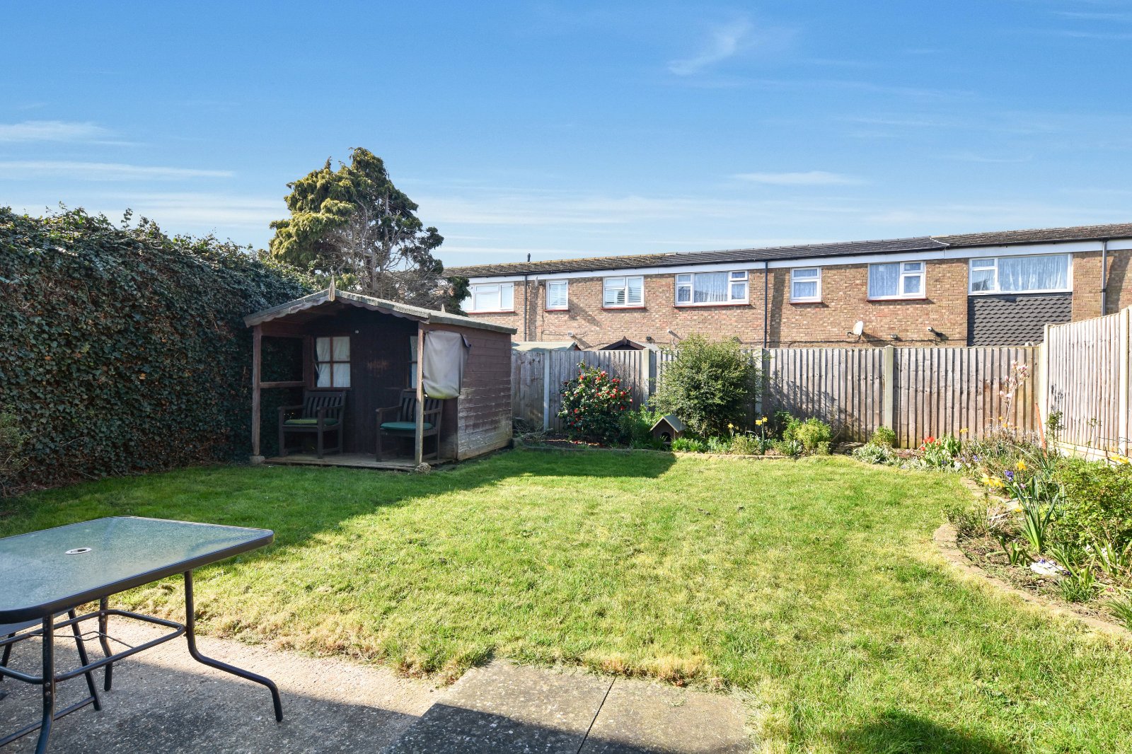 The property is located in a walkway position with lawned garden with mature shrubs and a low-level brick boundary wall. A pathway leads to the entrance door.