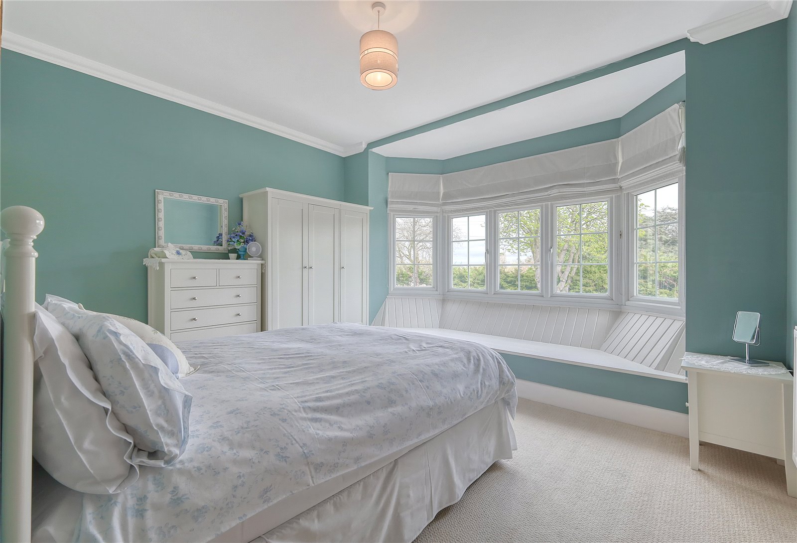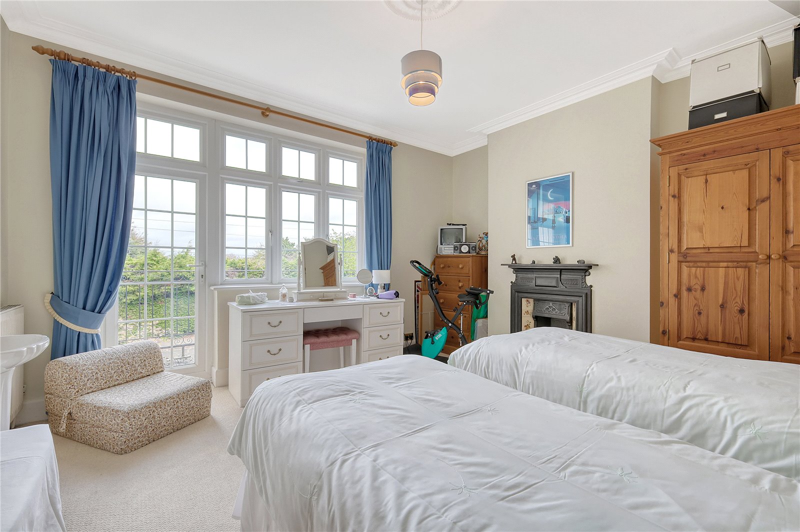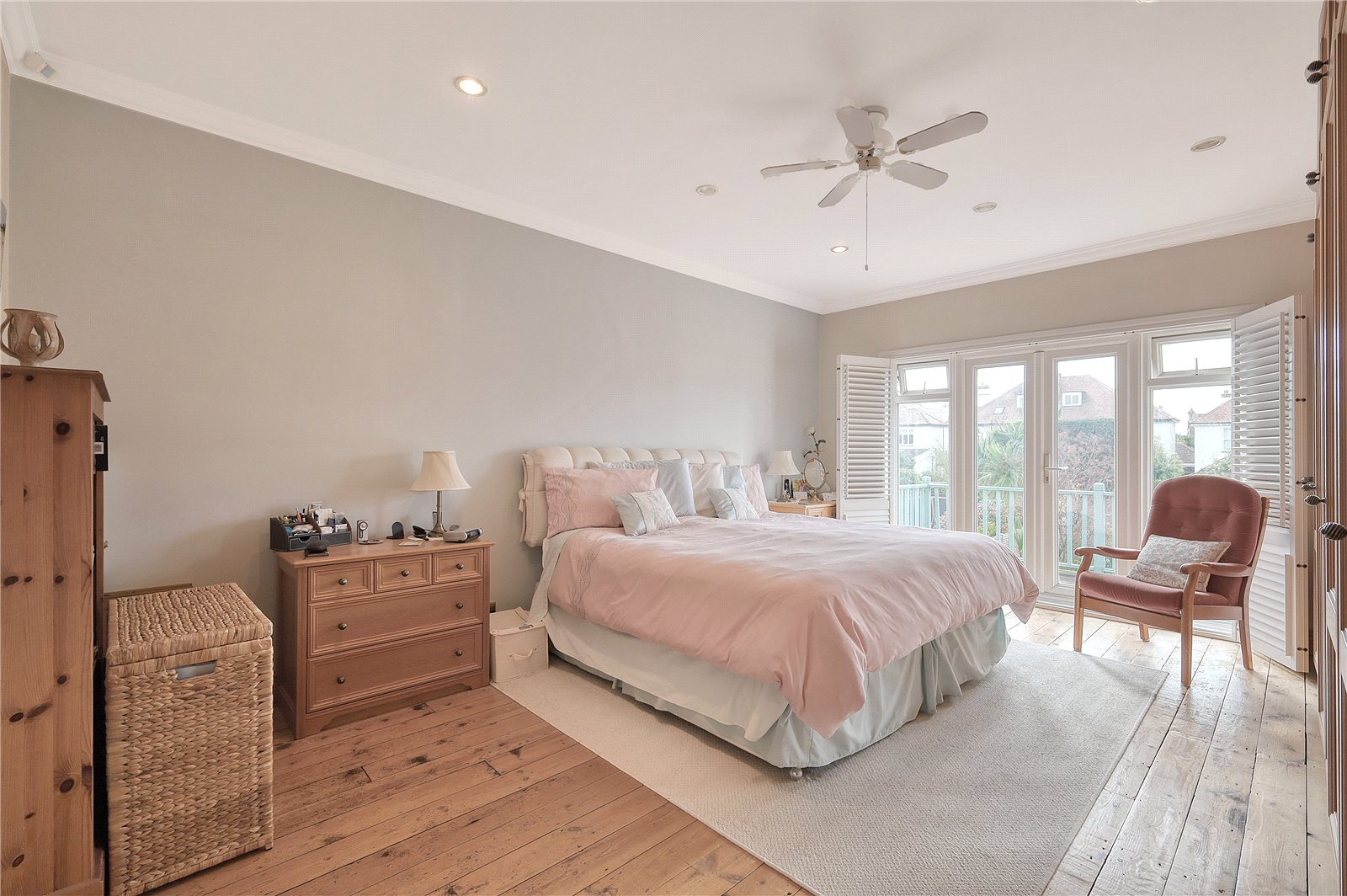 Incorporating extensive range of natural wood fronted wardrobe cupboards. This bright and spacious principal bedroom has wide double glazed windows and French double doors leading to the South facing balcony overlooking the rear garden. Exposed wood floorboards. Radiator. Coved ceiling with recessed lighting.