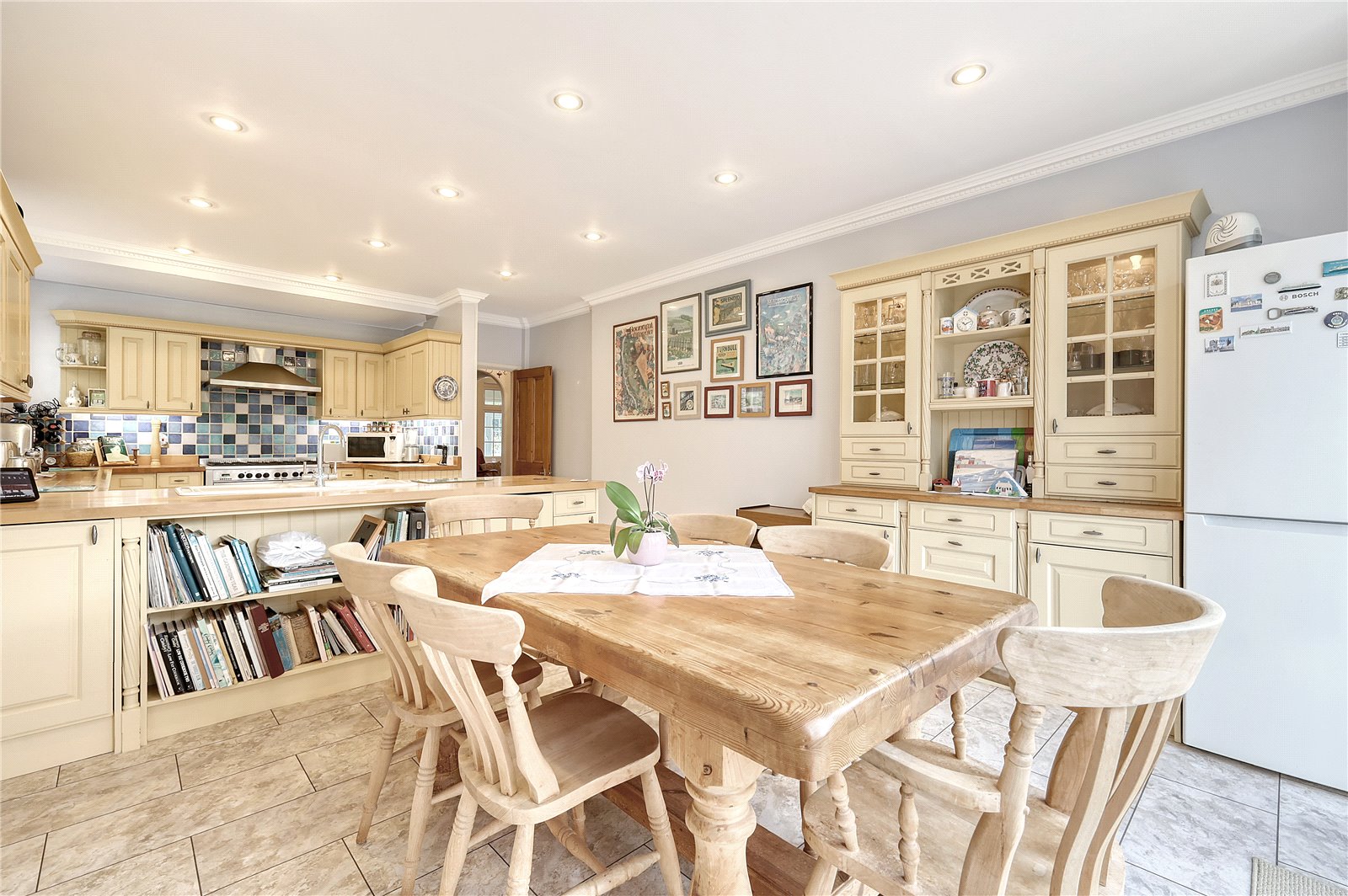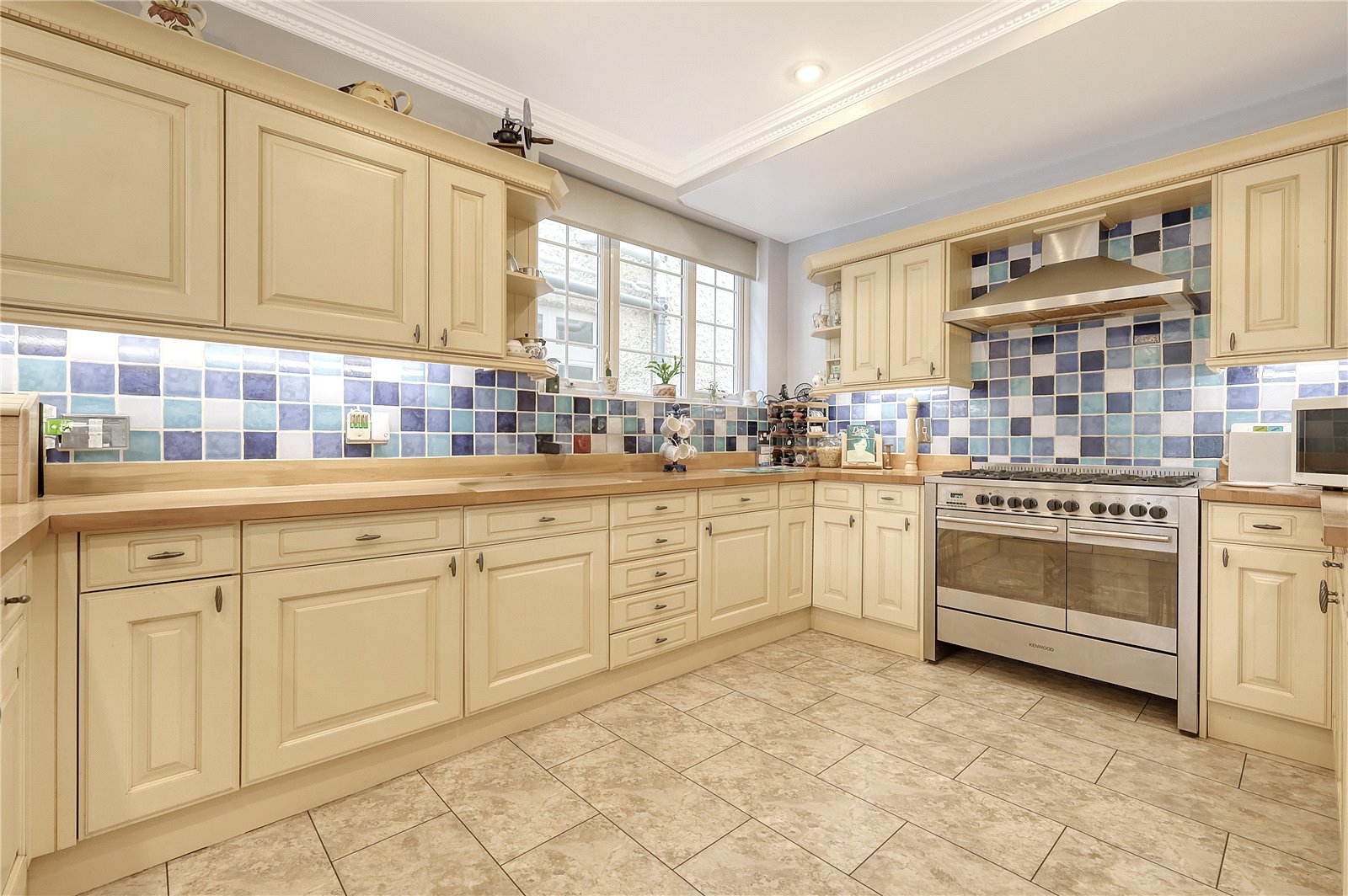 This wonderful "open plan" living space enjoys a dual aspect with double glazed window to side and almost full height and full width double glazed windows and French doors framing lovely views across the rear garden. Fitted with a wide range of natural wood fronted units and natural wood work surfaces with inset porcelain sink unit with mixer tap. Range of cupboards and drawers below. Built in dishwasher with matching door panel. Recess for double Range cooker. Matching wall mounted storage cabinets with lighting below. Concealed space and plumbing for washing machine and tumble dryer. Space for fridge/freezer. Attractive part tiled walls. Karndean tiled effect flooring. Matching display dresser with illuminated china display cabinets. Space for breakfast table. Two radiators. Ornate coved ceiling with recessed ceiling lighting.