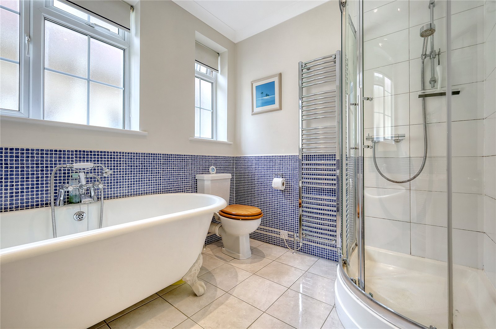 Fitted with a white suite compromising free standing rolled top bath with claw feet, mixer tap and shower attachment. Separately fully tiled Quadrant shower cubicle. Pedestal wash basin. Low flush WC. Part tiled walls. Fully tiled floor. Chrome heated towel rail. Coved ceiling with recessed ceiling lighting. Two double glazed windows to side.