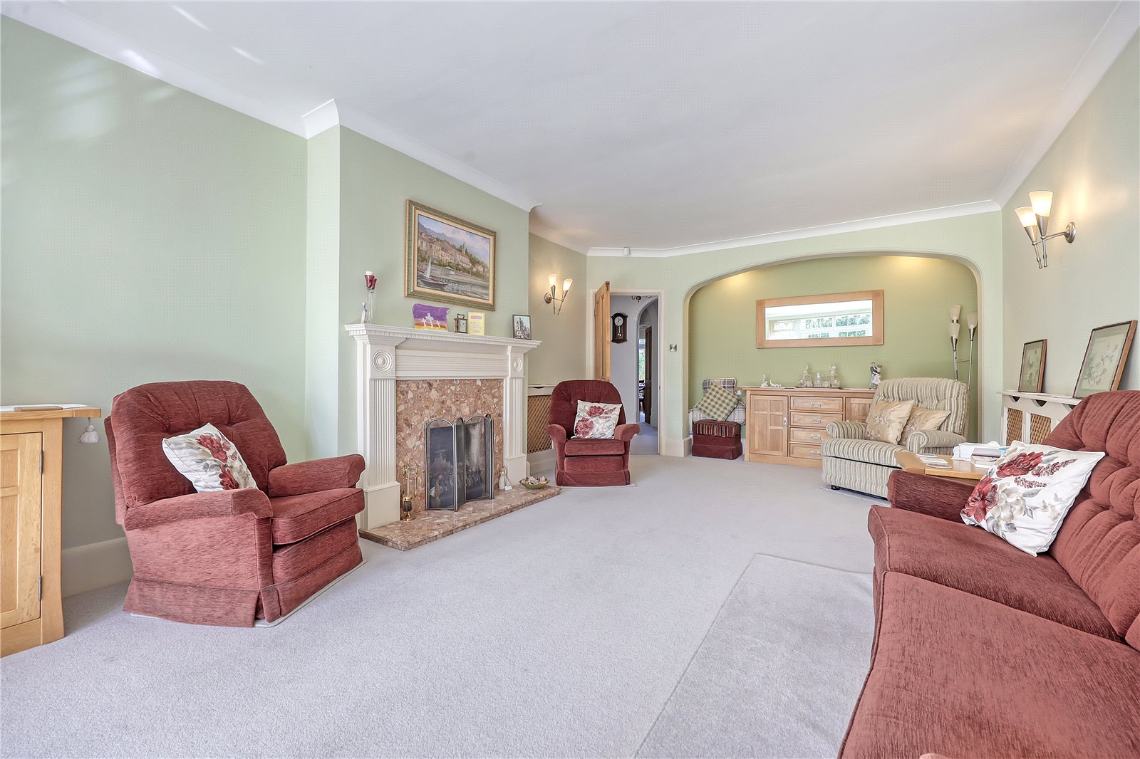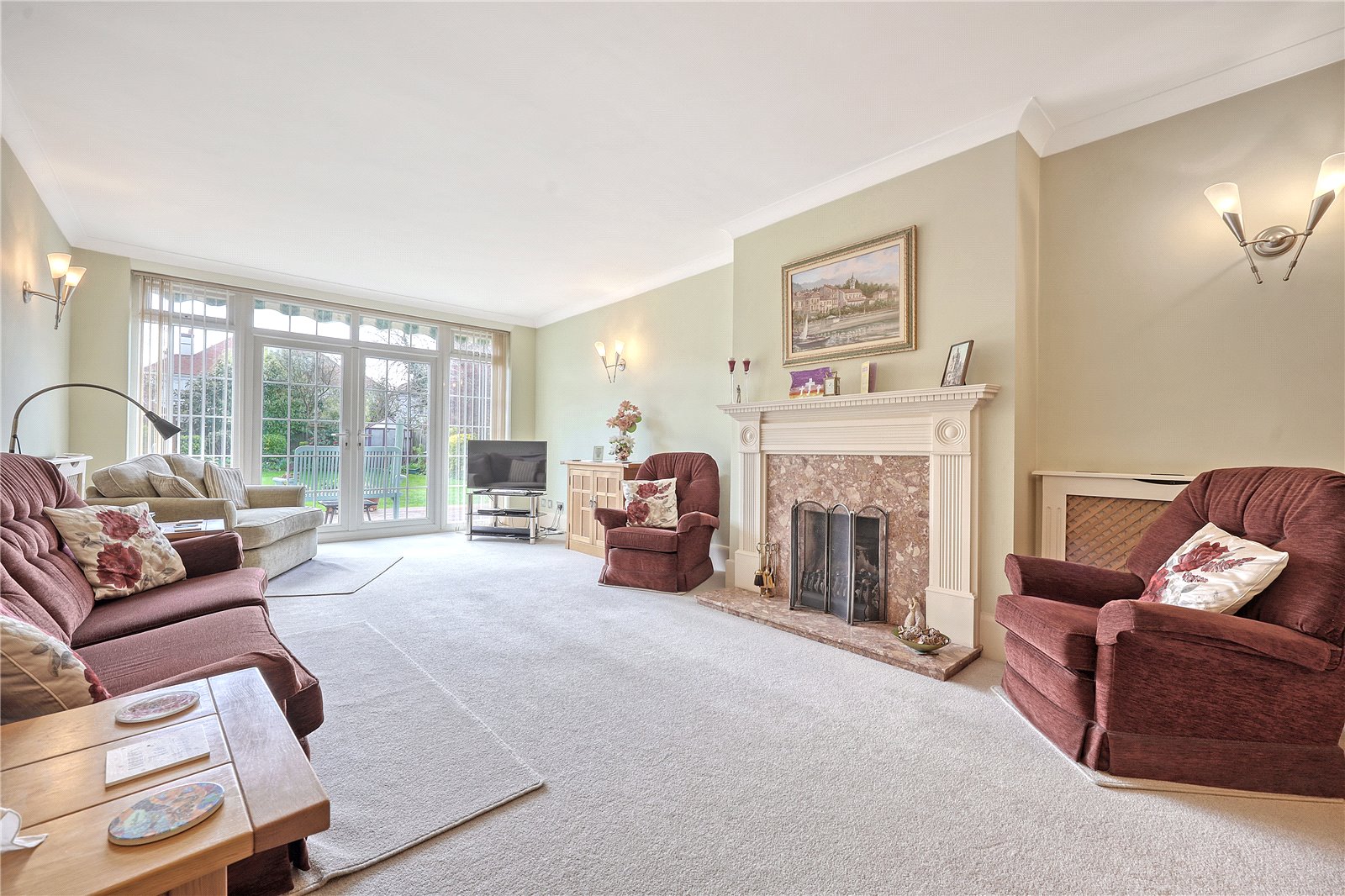 This bright and spacious South facing living room has almost full width and full height double glazed windows and French double doors framing lovely views across the rear garden. Attractive Adam style fireplace with marble insert and hearth, open grate. Coved ceiling. Three radiators with decorative covers. Feature arched recess.