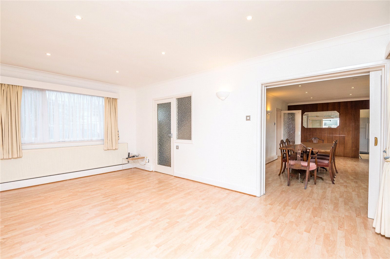 This bright and well proportioned living room enjoys a dual aspect with double glazed windows to front and side. Radiator. Wood flooring. Coved ceiling with recessed lighting. Glazed double doors leading to dining room. Almost full width bi-folding doors leading to the family room and garden.