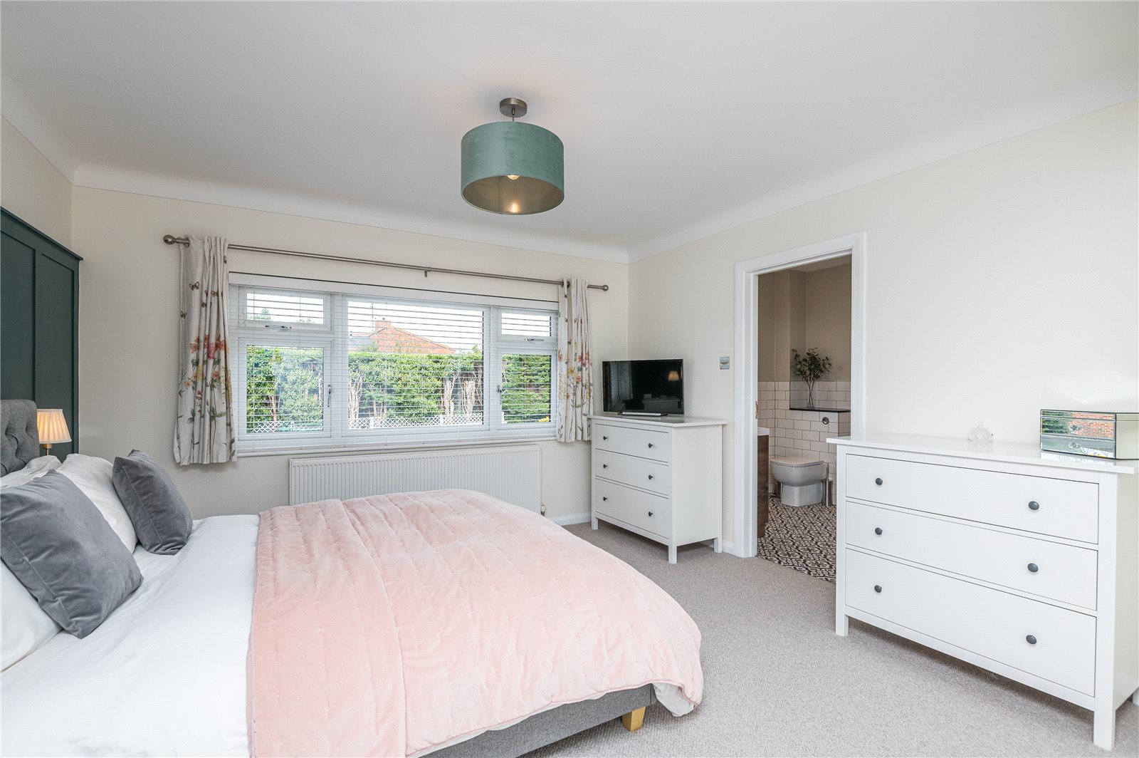 Incorporating extensive range of modern built in wardrobe cupboards. This large and sumptuous master bedroom suite has feature wall panelling to one wall, double glazed picture window overlooking the rear garden. Radiator. Door to: