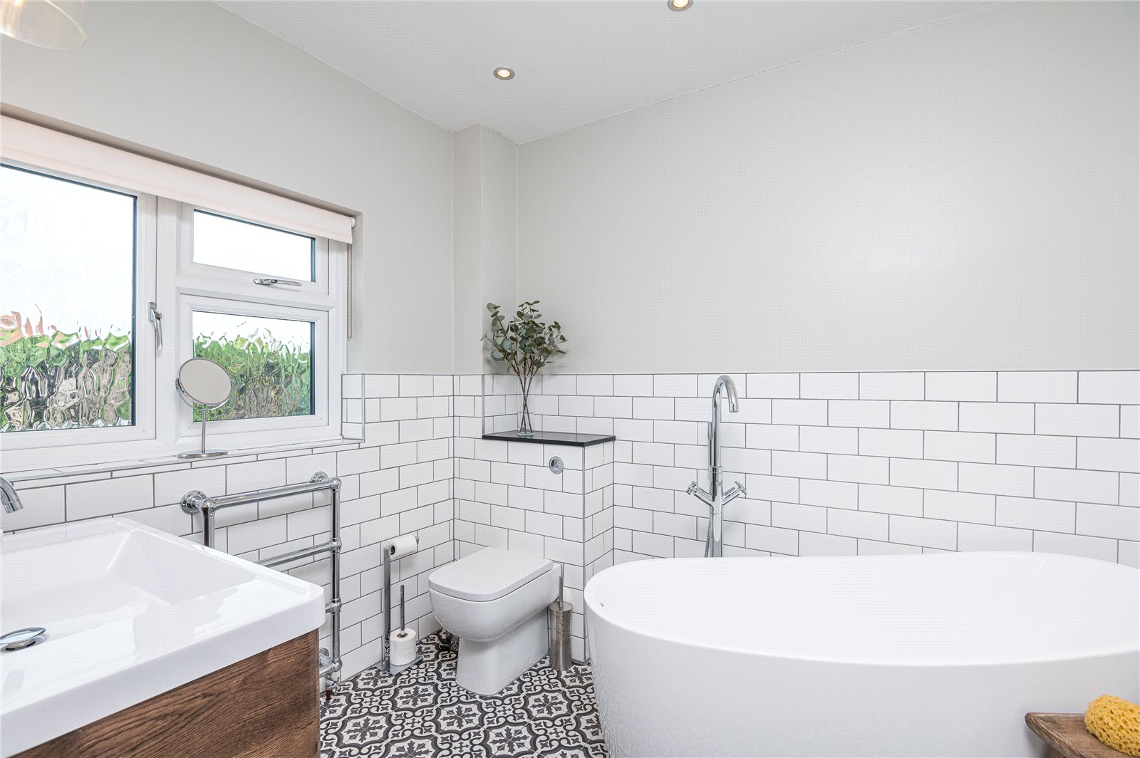 Fitted with a modern luxury white suite comprising free standing oval shaped bath, bath filler and shower attachment. Large separate fully tiled shower cubicle with rainwater shower head and further attachment. Vanity unit with wash basin and mixer tap, drawers below. Concealed flush WC. Attractive tiled walls and floor with underfloor heating. Chrome heated towel rail. Recessed ceiling lighting. Double glazed window to rear.