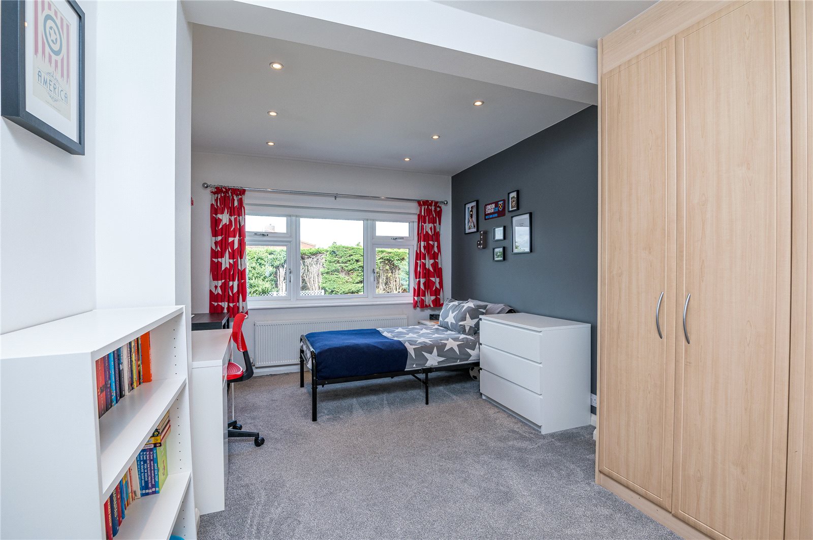 Incorporating range of modern built in wardrobe cupboards. Double glazed window overlooking the rear garden. Radiator. Recessed ceiling lighting.