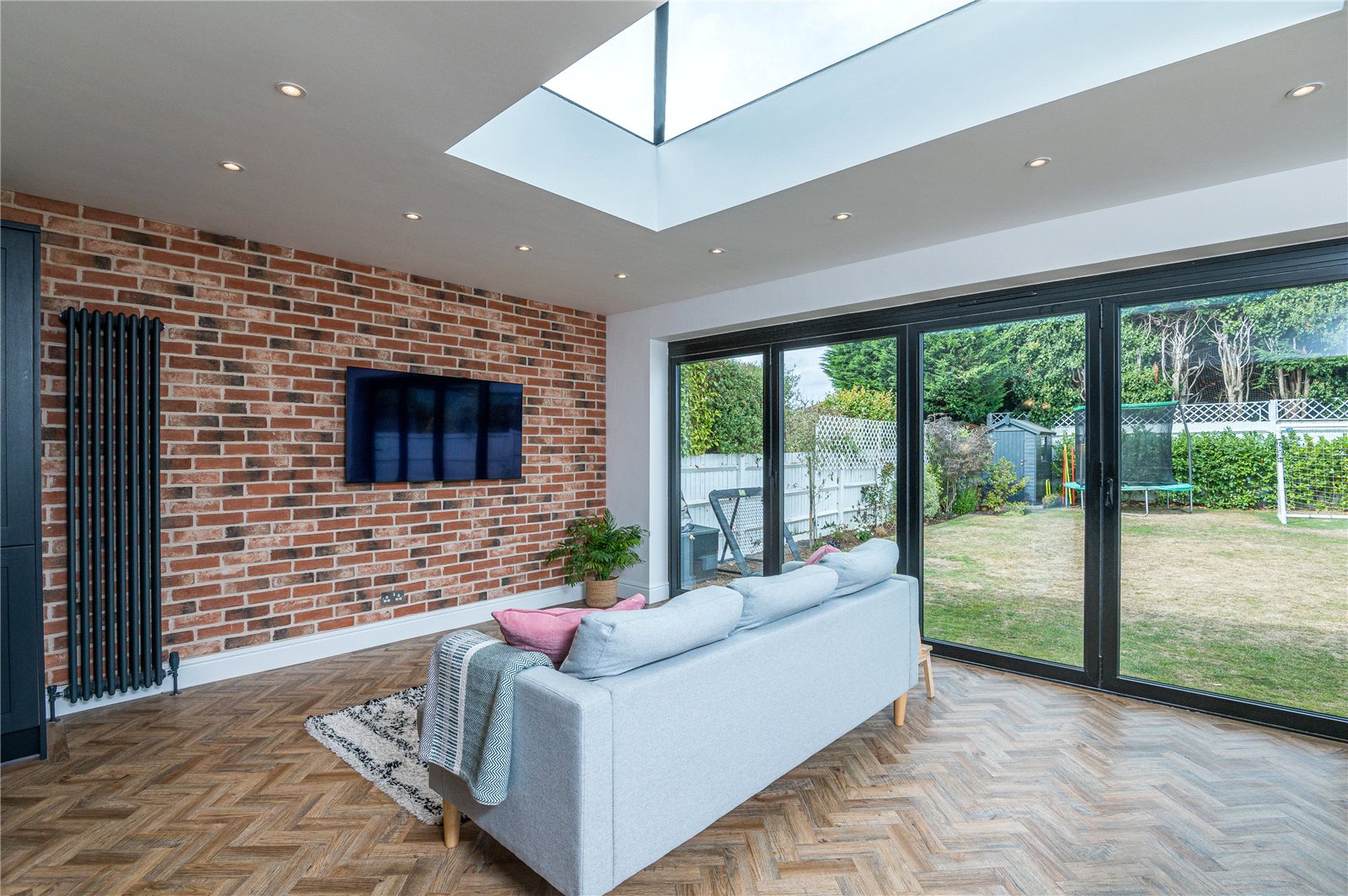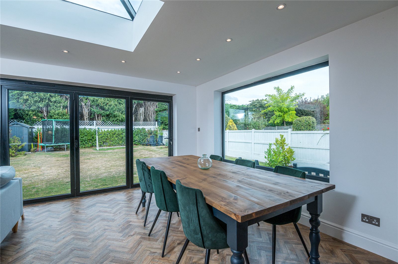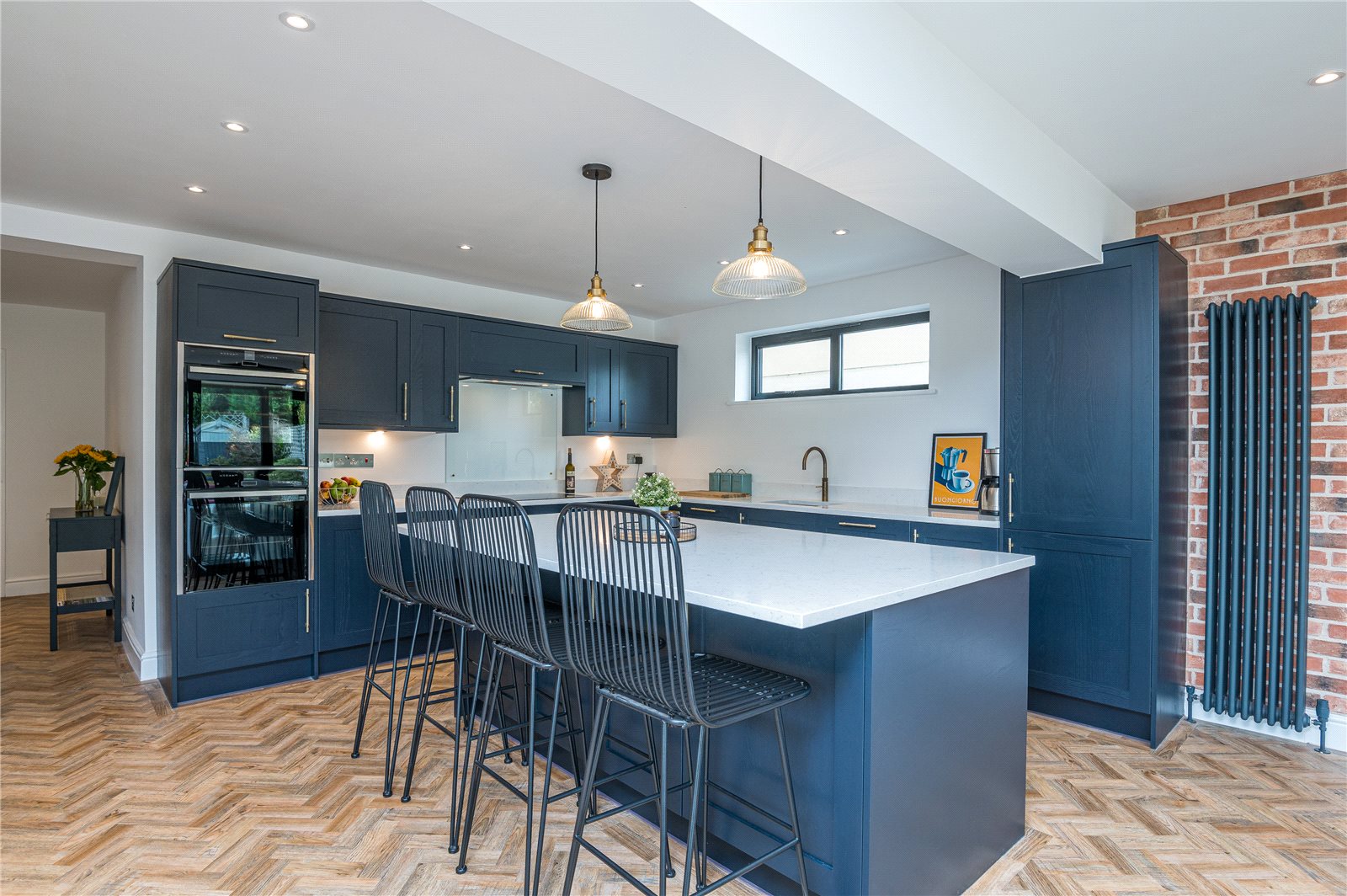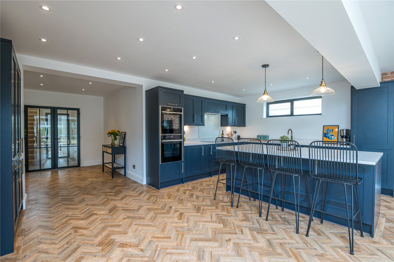 Overall size. Approached via double glazed doors from the entrance hall. This fabulous open plan contemporary living space enjoys a triple aspect with double glazed picture window to side, picture window to side. and almost full width double glazed bi-folding doors, Framing lovely views across the rear garden. Attractive Karndean Herringbone pattern wood effect flooring with underfloor heating. Feature exposed brickwork wall. Large double glazed skylight lantern. Space for dining table and sofas. Two designer radiators. Recessed ceiling lighting. The kitchen is fitted with a modern luxury range of navy blue units with white quartz work surfaces. Inset sink unit with 'Quooker' mixer tap/hot water tap. Range of cupboards below with built in 'Neff' dishwasher with matching decor panel. Inset 'Neff' induction ceramic hob with concealed extractor fan above. Glass splash back. Saucepan drawers below. Cupboards to either side. Oven housing with built in twin 'Neff' ovens, cupboards above and below. Three quarter storage cupboards plus retractable larder cupboard. Large feature central island unit with quartz work top/breakfast bar with cupboards and drawers below. Built in 'Neff' refrigerator and freezer with matching decor panels. Doors to study. Doors to: