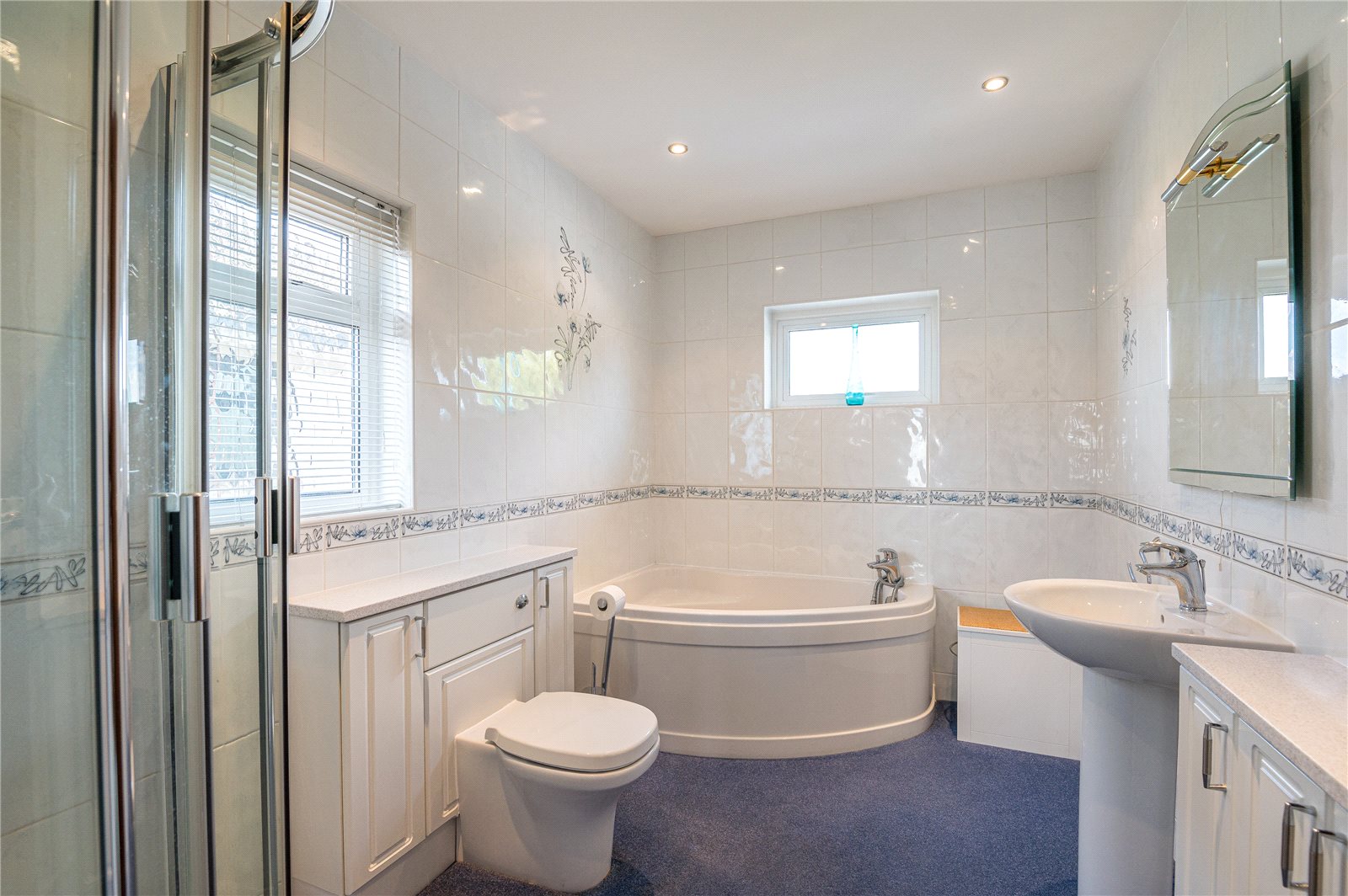 Fitted with a white suite comprising panelled corner bath and mixer tap and shower attachment. Separate fully tiled quadrant corner shower cubicle. Pedestal wash hand basin with mixer tap. Concealed WC. Fully tiled walls. Shaver point. Chrome heated towel. Recessed ceiling lighting. Double glazed windows to side and rear.