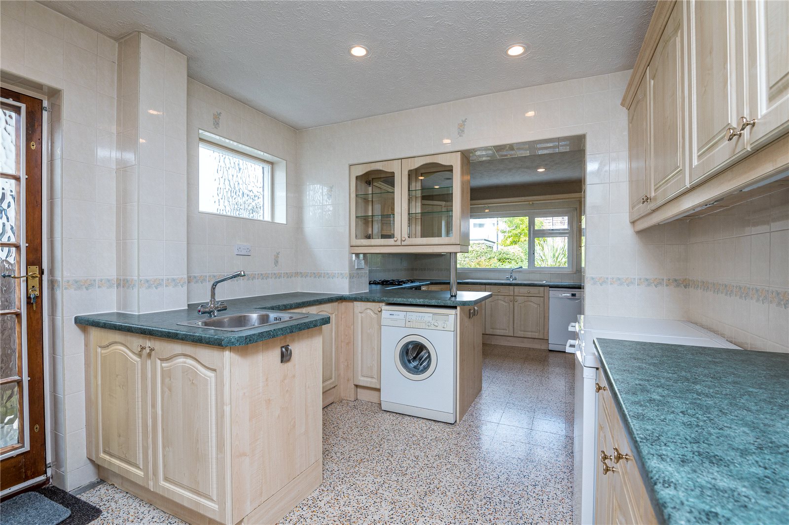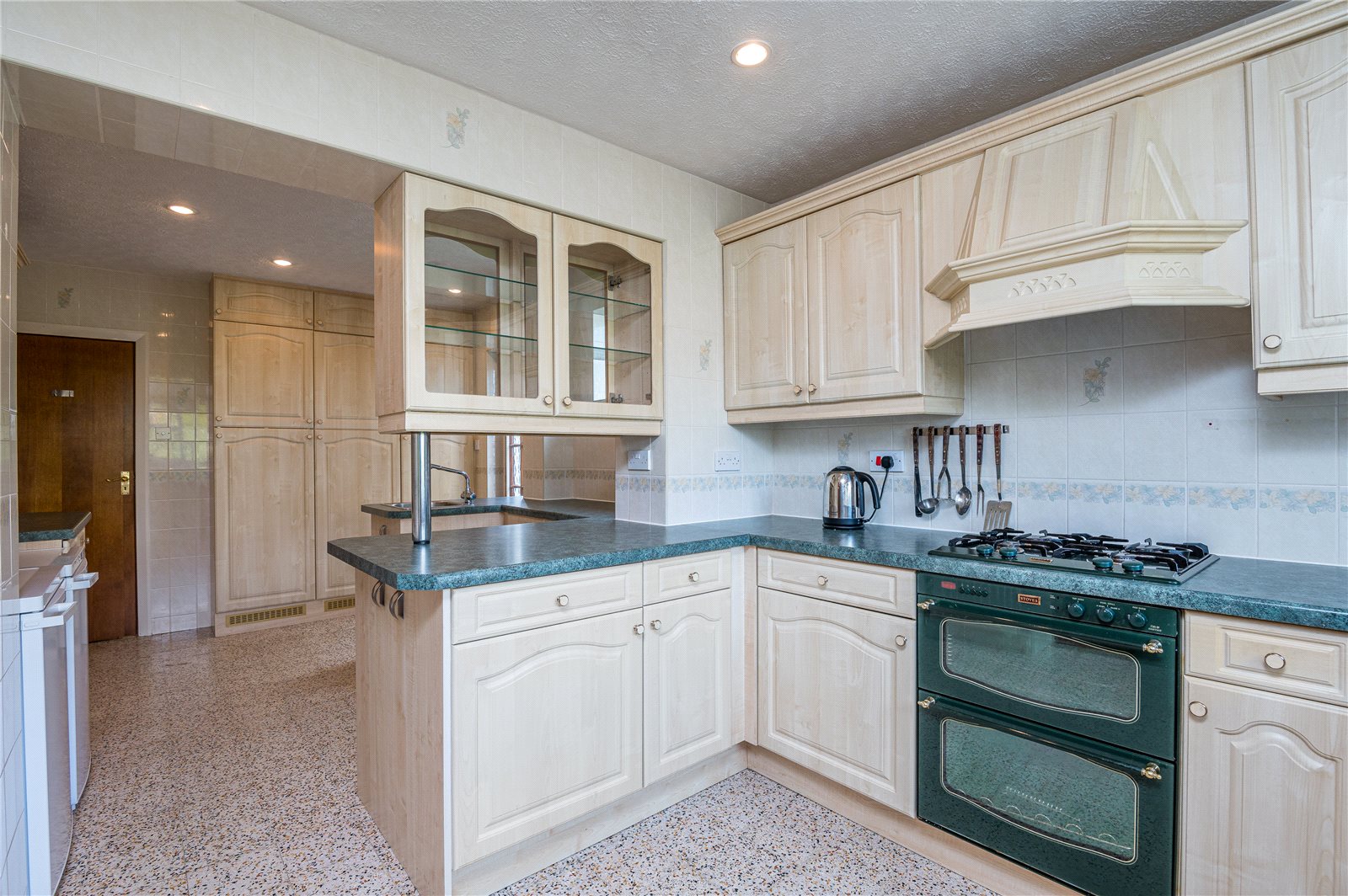 Fitted with an extensive range of modern units and rolled edge work surfaces with inset double bowl sink unit with mixer tap. Range of cupboards and drawers below. Space and plumbing for dishwasher. Inset "Stoves" four ring gas hob with extractor hood above and built in "Stoves" oven below. Further rolled edge working surface with inset stainless steel preparation sink with mixer tap. Range of cupboards below. Space and plumbing for washing machine. Space for fridge and freezer. Peninsular unit with matching work surface, cupboards below and china display cabinet above. Matching range of wall mounted storage cabinets with lighting below. Range of full height matching cupboards with retractable larder cupboard and one housing "Potterton" gas fired central heating boiler. Fully tiled walls and floor. Recessed ceiling lighting. Radiator. Double glazed window overlooking the rear garden. Secondary double glazed window to side. Secondary double glazed door to side giving access to side and rear.