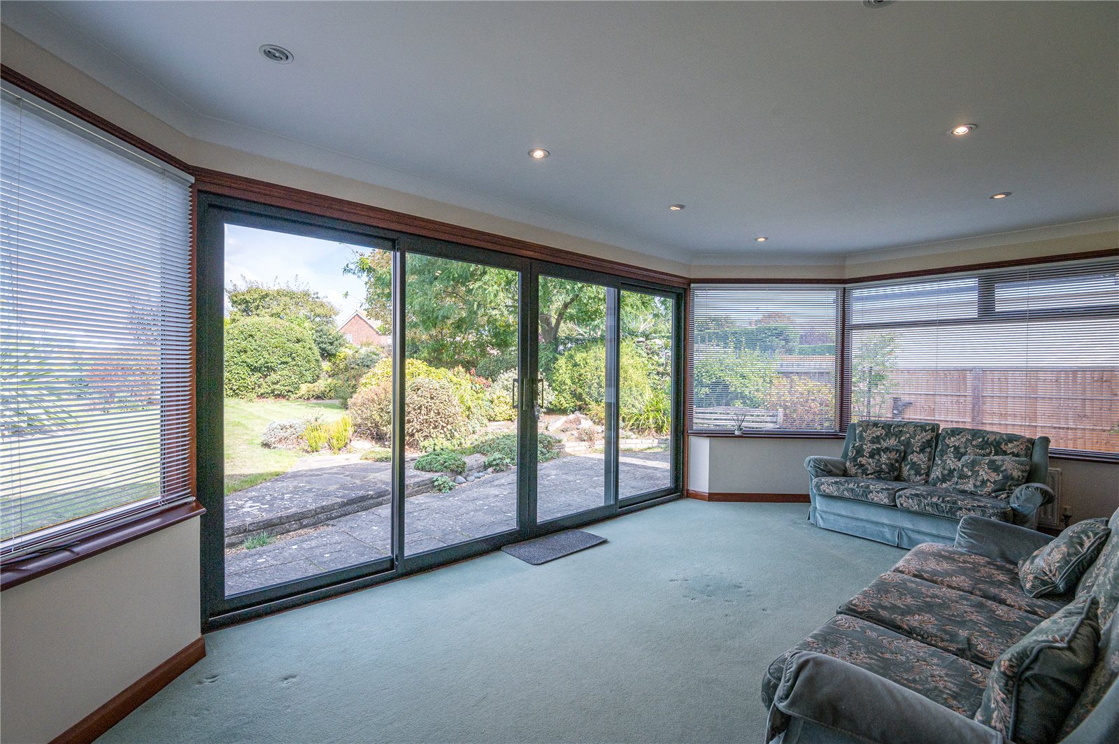 This bright and spacious living room enjoys a triple aspect with double glazed windows to either side and almost full width double glazed patio doors framing lovely views across the rear garden. Two radiators. Coved ceiling with recessed lighting.