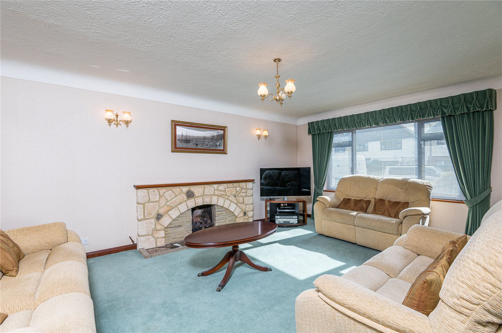 Overall size. This bright and beautifully proportioned "L" shape living room has a double glazed picture window to front. Radiator. Attractive natural stone fireplace with fitted gas fire, timber mantle. Glazed window to rear overlooking the dining room and garden. Archway leading to: