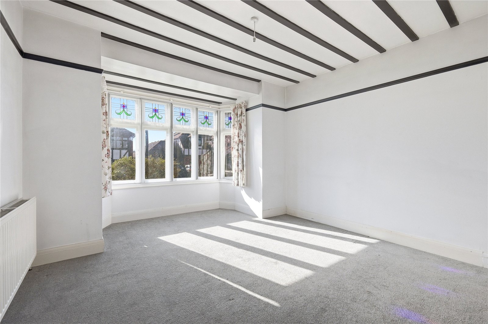 Approached via glazed double doors from the Reception Hall. This bright well-proportioned South facing room has a wide secondary double glazed bay window to front with pretty stained glass leaded light upper section. Redbrick fireplace with open grate. Beamed ceiling. Picture rail. Radiator.