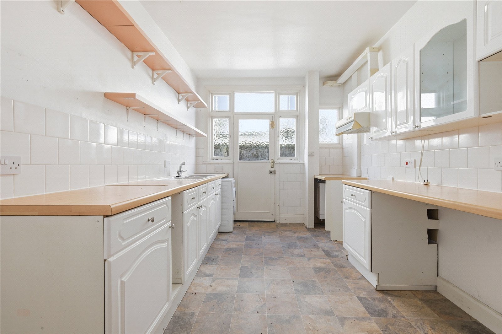 Further rolled edge work surface with further storage cupboards. Wall mounted storage cabinets. Potterton gas fired central heating boiler. Part tiled walls. Windows and half glazed door to side giving access to front and rear.