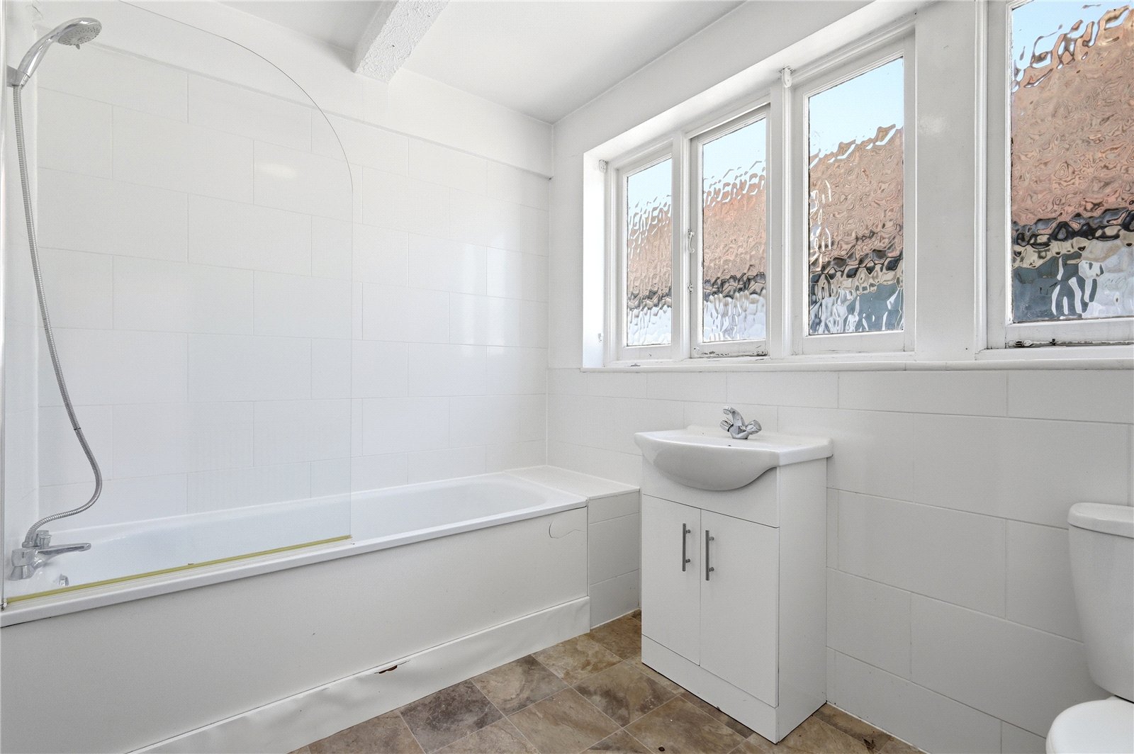 White suite comprising panelled bath with mixer tap, shower attachment and fitted shower screen. Vanity unit with wash basin, cupboard below. Low flush WC. Part tiled walls. Radiator. Window to side.