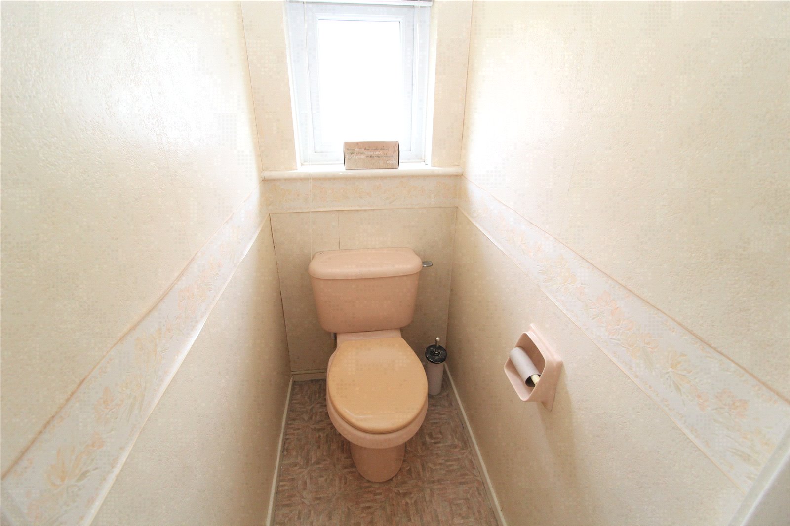 Two piece coloured suite comprising pedestal wash hand basin and low flush w.c., Fully tiled. Double glazed leaded light obscure window to front.