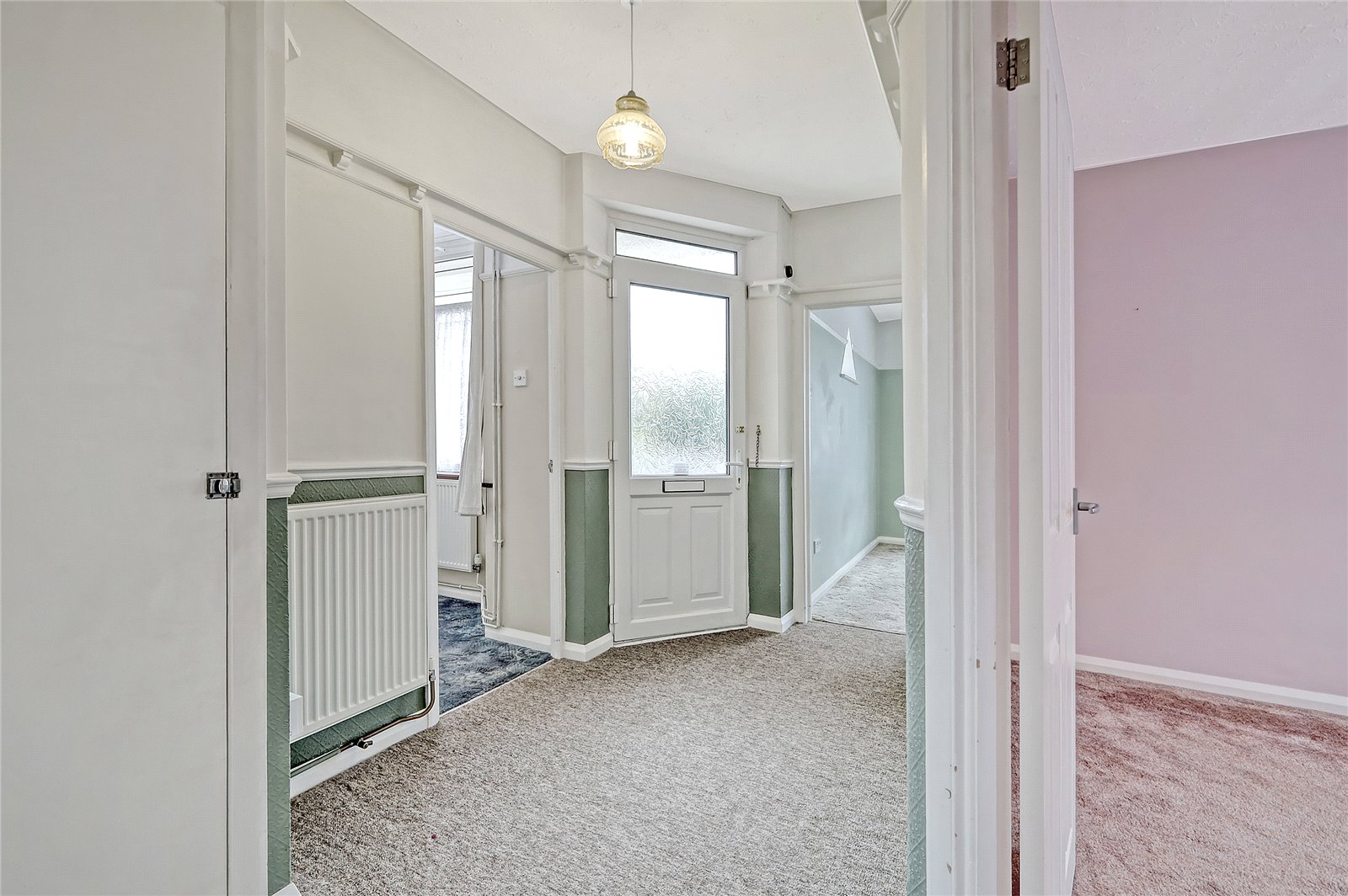 Approached via UPVC security door with inset obscured glazed panels. Doors lead off to all rooms. Storage cupboard to side housing utility. Wall mounted radiator. Feature dado rail. Feature delft shelf. Wall mounted thermostatic heating control.