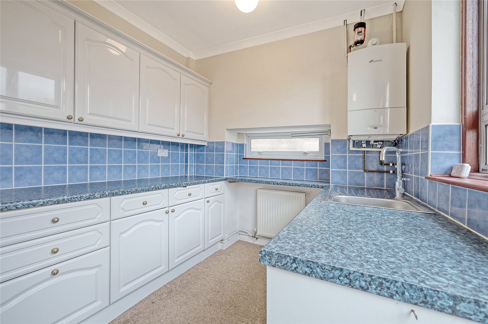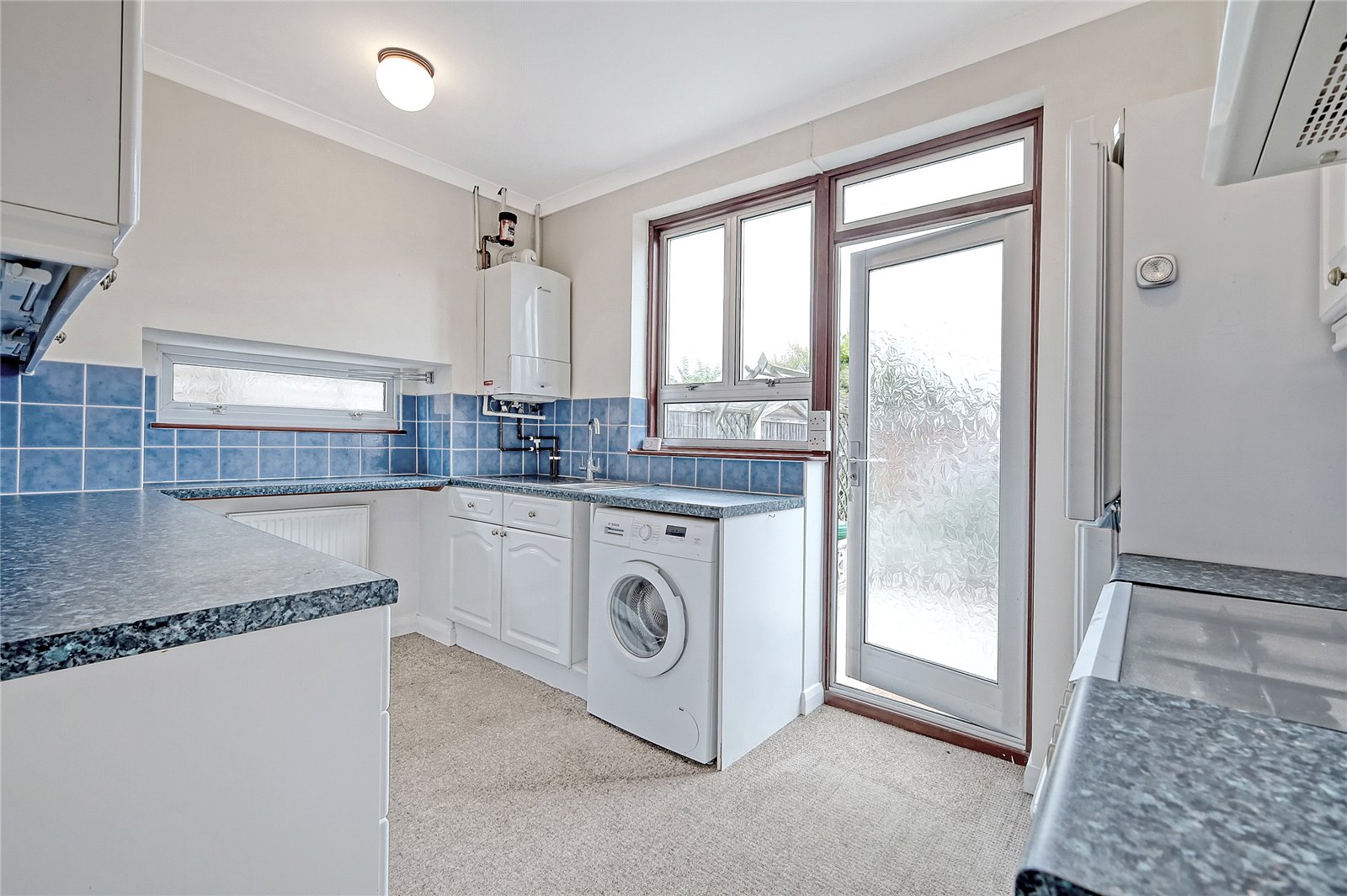 Aluminium framed double obscured glazed door leading on to rear garden with double glazed window adjacent and to side. Kitchen is fitted with a range of base and eye level cabinets incorporating a rolled edge working surface. Inset stainless steel sink with mixer tap and drainer unit. Space for free standing gas cooker with fitted extractor hood above, existing to remain. Space and plumbing for washing machine. Space for fridge/freezer. Fully tiled splash backs. Wall mounted radiator. Coved cornice to smooth plastered ceilings. Access to loft space. Wall mounted Worcester Bosh combination gas fired boiler.