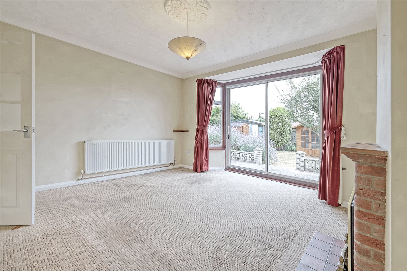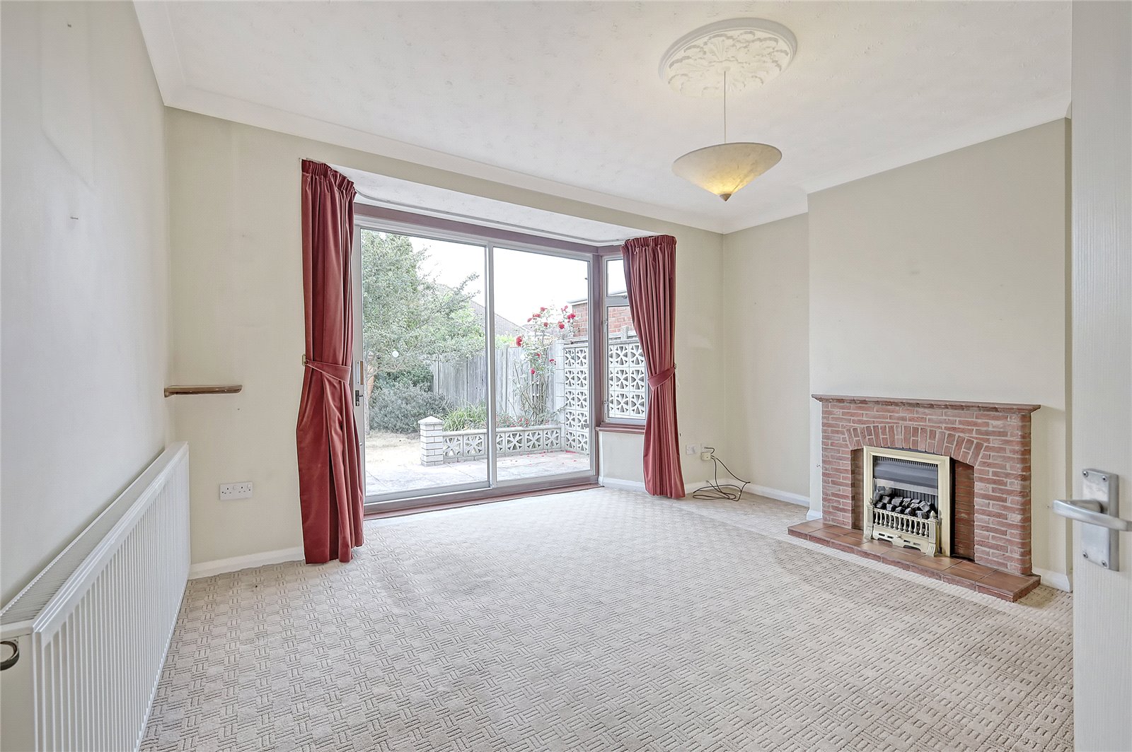 Into bay. Large Aluminium framed sliding patio door to rear leading on to rear garden with double glazed windows adjacent. Wall mounted radiator. Feature fireplace with tiled hearth, brick mantle and inset gas fire. Coved cornice to ceiling with feature ceiling rose.