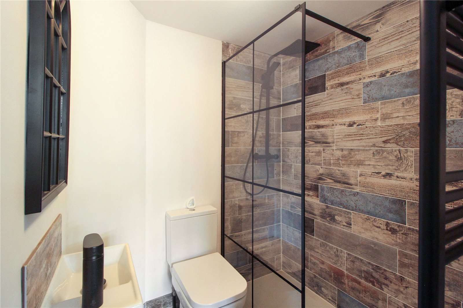 Three-piece shower room suite comprising of low-level WC, wall mounted enamel hand wash basin with vanity unit, and walk-in shower cubicle with feature tiles. Completed with heated towel rail, smooth plastering, ceiling light and extractor fan.