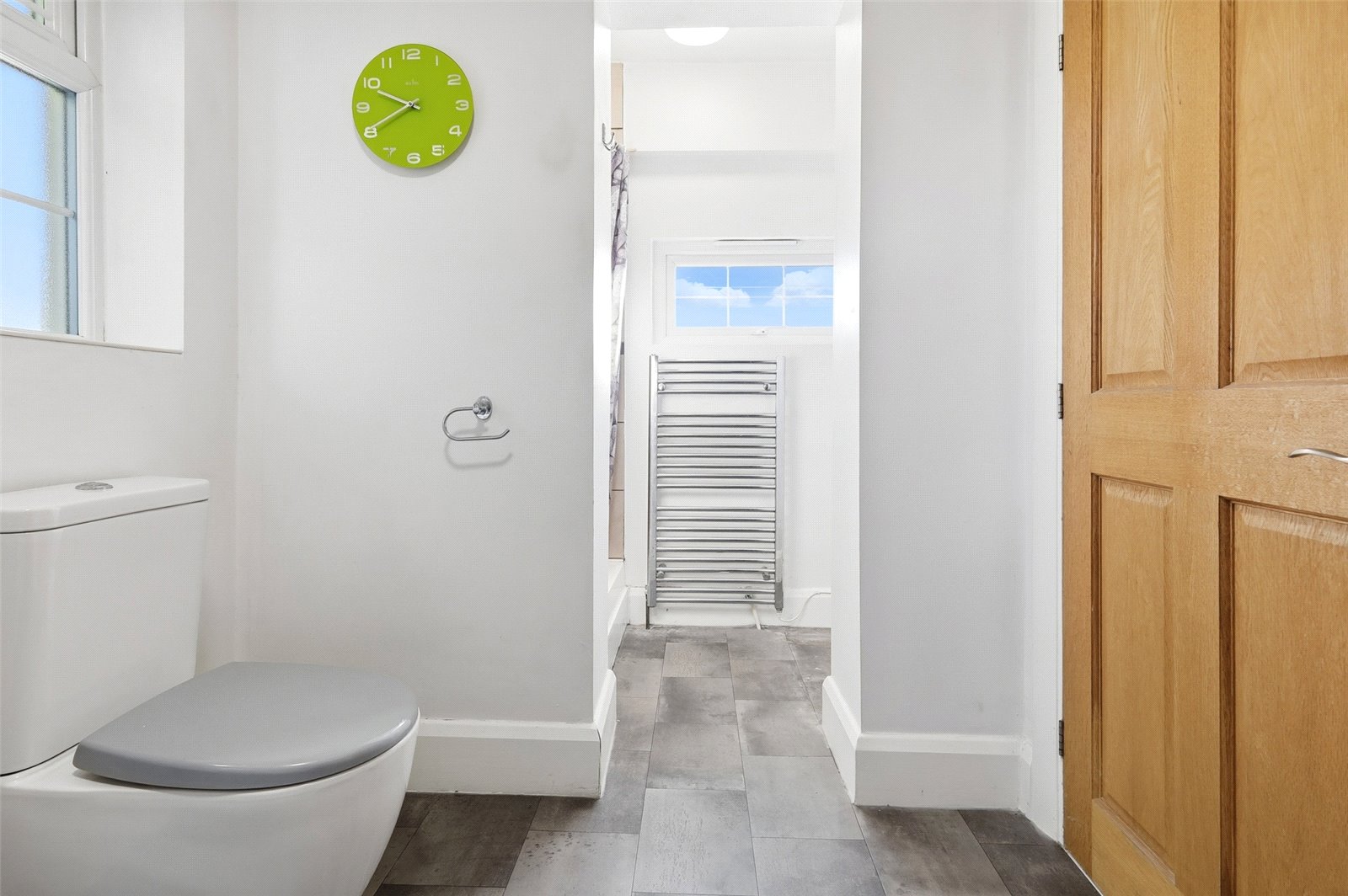 Two double obscured glazed windows to side. Further obscured glazed window to front. Modern four piece suite comprising low flush WC, wall mounted wash basin with mixer tap. Double ended bath with mixer tap and enclosed shower cubicle with wall mounted mixer, adjustable showerhead. Chrome heated towel rail. Wall mounted radiator. Tiled effect vinyl flooring. High level skirting. Part tiled walls. Smooth plastered ceiling.