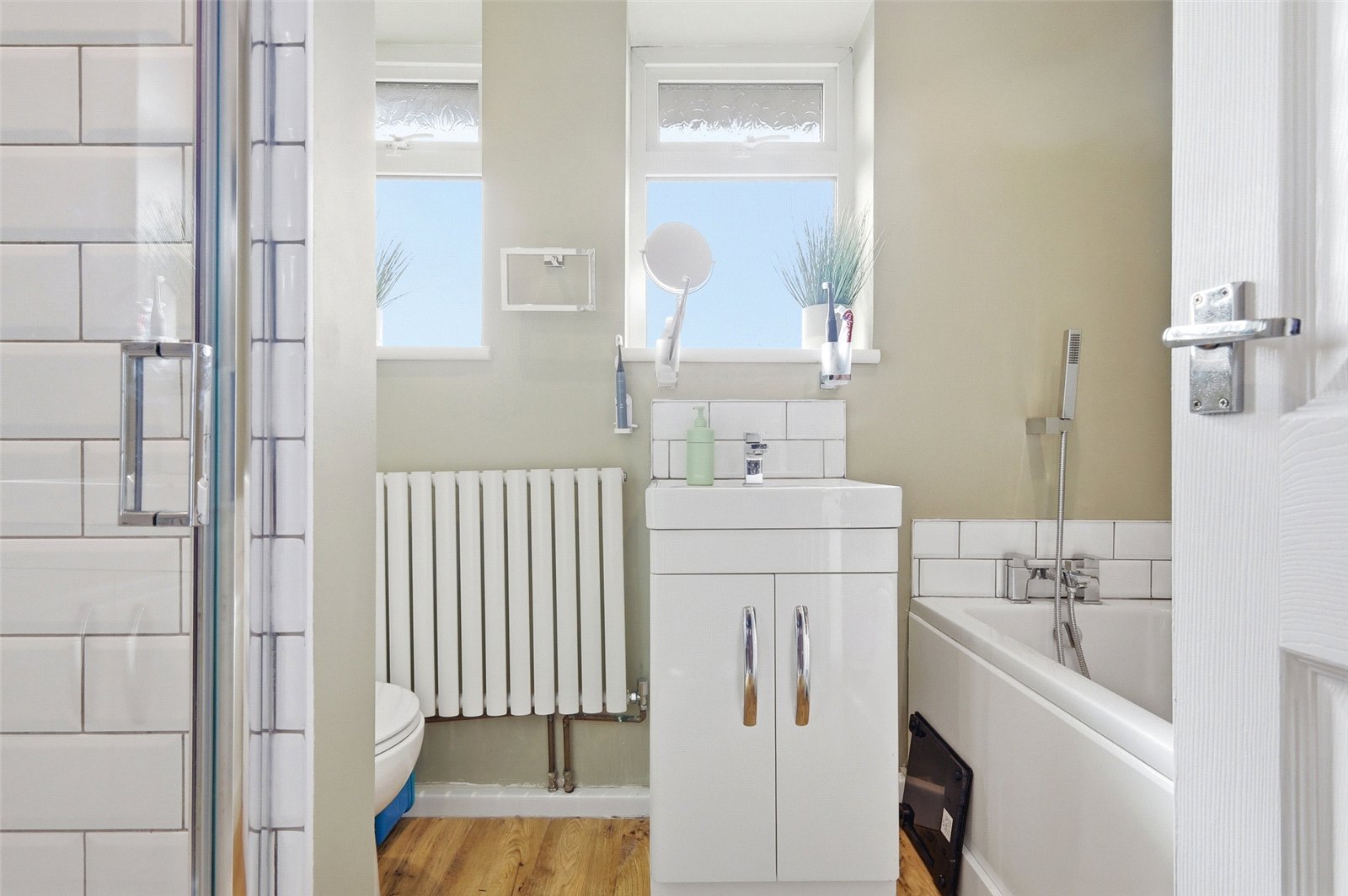 Two obscure double glazed windows to rear, 'Karndean' oak flooring, designer radiator. Fitted with a four-piece suite comprising panel-enclosed bath with metro tiled splashback and mixer tap with shower attachment, vanity wash basin with gloss fronted cabinet, close-coupled dual-flush WC, and independent fully-tiled shower cubicle with rainwater and handheld shower heads. Smooth plastered ceiling with recessed LED lighting.