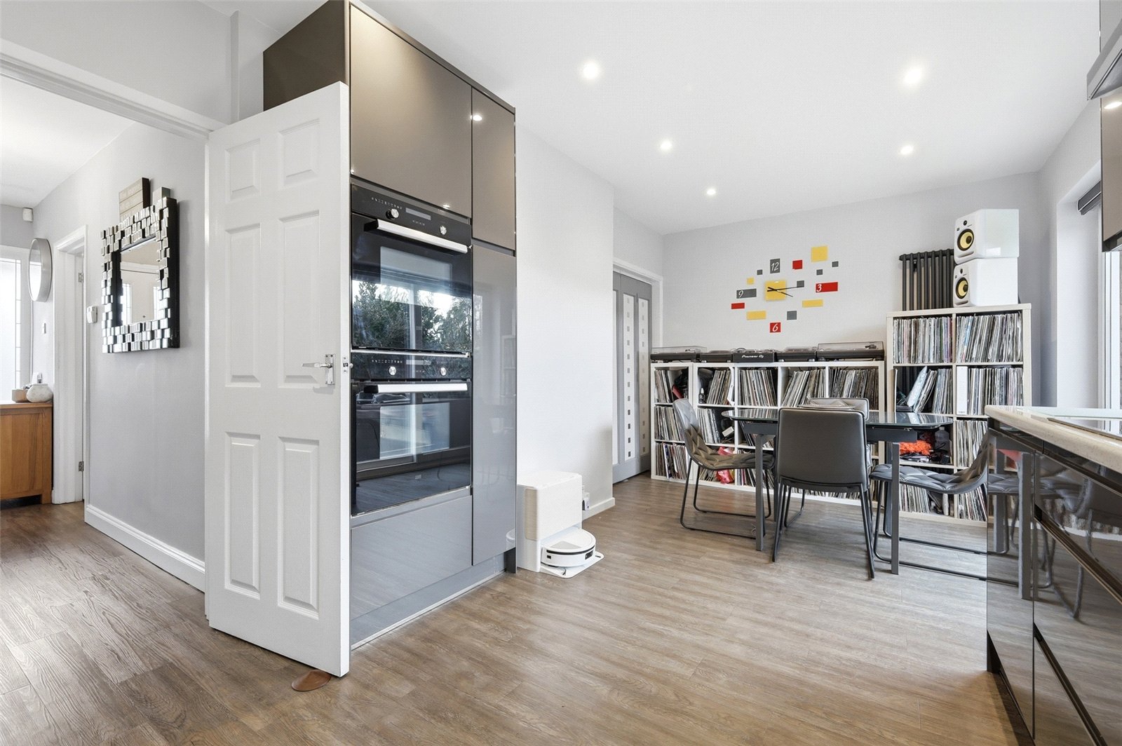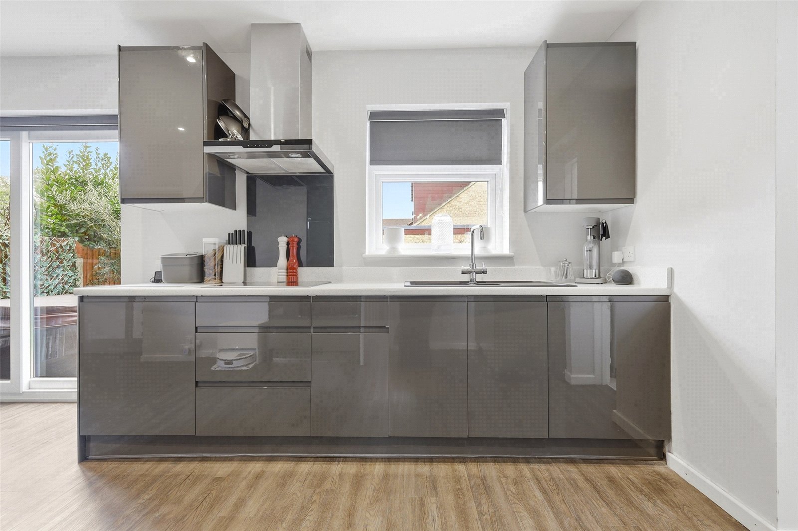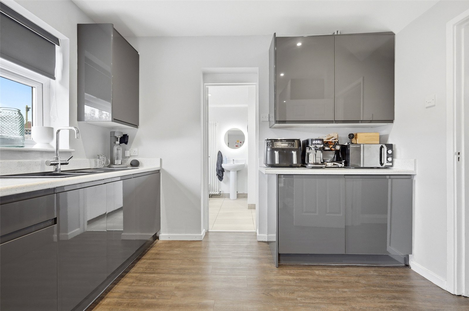 Double glazed patio doors lead onto the landscaped rear garden, double glazed window to rear. The kitchen has been planned and fitted with a comprehensive range of gloss fronted, contemporary base and eye level cabinets with quartz effect rolled edged working surfaces, matching upstands and inset one-and-a-quarter bowl polycarbonate sink unit with hot water hydro-tap. The range of integrated appliances includes split-level twin fan-assisted electric ovens and four-ring induction hob with designer extractor canopy above, integrated dishwasher, fridge and freezer. 'Karndean' oak flooring, vertical designer radiator. Smooth plastered ceiling with recessed LED lighting. Access to: