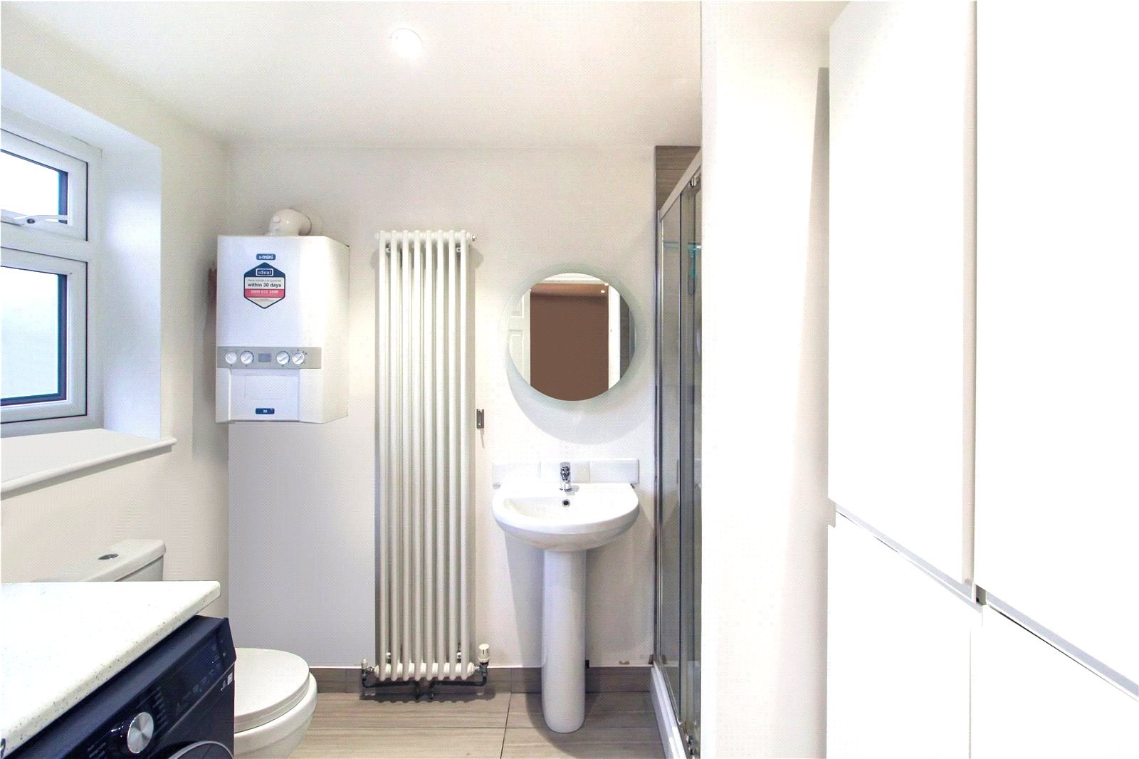 Obscure double-glazed window to rear. Fitted with a three-piece suite comprising of fully-tiled shower enclosure with handheld and rainwater shower heads, pedestal wash basin with tiled splashback and dual-flush, close-coupled WC. Designer vertical radiator. Space, plumbing and drainage for automatic washing machine and tumble dryer with work surface above. Wall-mounted condensing gas boiler serving domestic hot water and central heating system. Feature smooth plastered vaulted ceiling with recessed LED lighting.