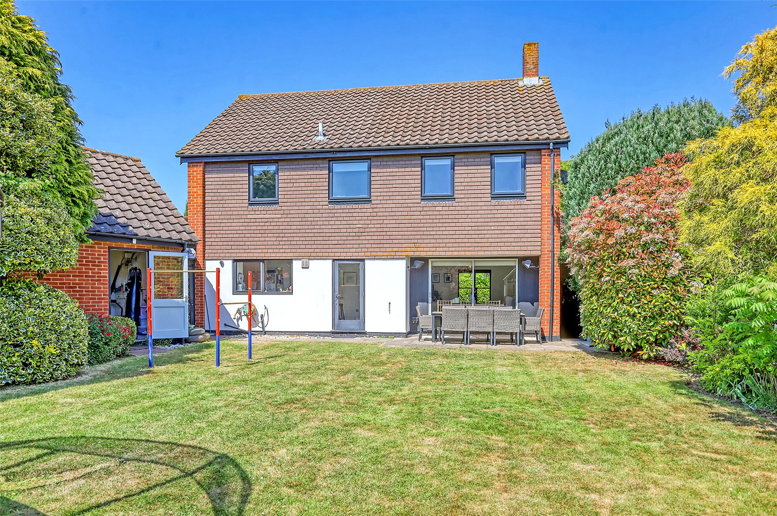 Double width garage with up and over door. Light and power. Half glazed door to garden. Large loft storage area. (Agents note: the garage is currently divided into two rooms, a storage area and home gymnasium which could also be used as a home office/business).