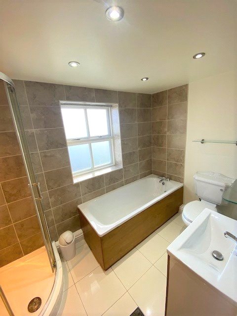 Obscure hardwood double glazed multi pane window to front. A professionally planned and fitted room with a four piece suite comprising oak effect panel enclosed bath with chrome mixer tap, contemporary vanitory wash hand basin with full width enamel sink and chrome mixer tap, Regency style close coupled w.c. and a pair of sliding doors give access to a corner quadrant shower enclosure with integrated power shower with hand held and overhead rainwater shower heads. Polished porcelain ceramic tiled floor. 'Old school' radiator style heated towel rail. Stone effect tiling to all walls with bordered edged tiles. Access to roof space. Smooth plastered ceiling with recessed spa style LED lighting.