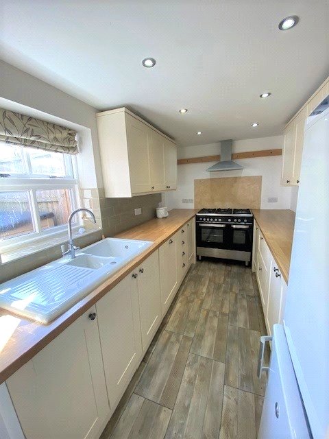 Hardwood double glazed multi-pane window to front. 'Wunda Floor' underfloor heating with oak board effect porcelain tiled floor. The Kitchen has been professionally planned and fitted with a comprehensive range of base and pelmeted eye level cabinets in cream 'Country Cottage' units with beech effect square edged working surfaces and inset one and a quarter bowl enamel sink with chrome mixer tap. Built in dishwasher. Drawer stack. Gloss ceramic brick tiled splashbacks with bordered edging. Space for upright fridge freezer. Space for 'Kenwood' range cooker (to remain) with oversized Travertine splashback and contemporary brushed steel extractor canopy above. Smooth plastered ceiling with recessed LED lighting.
