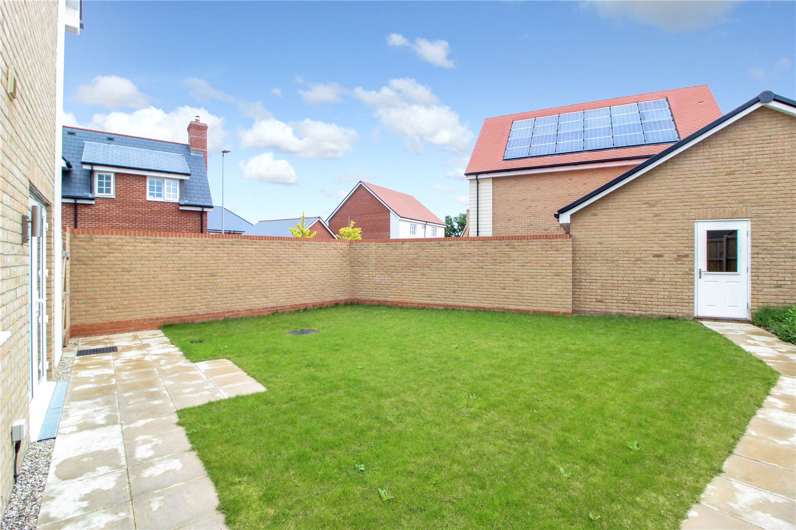 Mostly laid to lawn with paved pathway leading to garage.