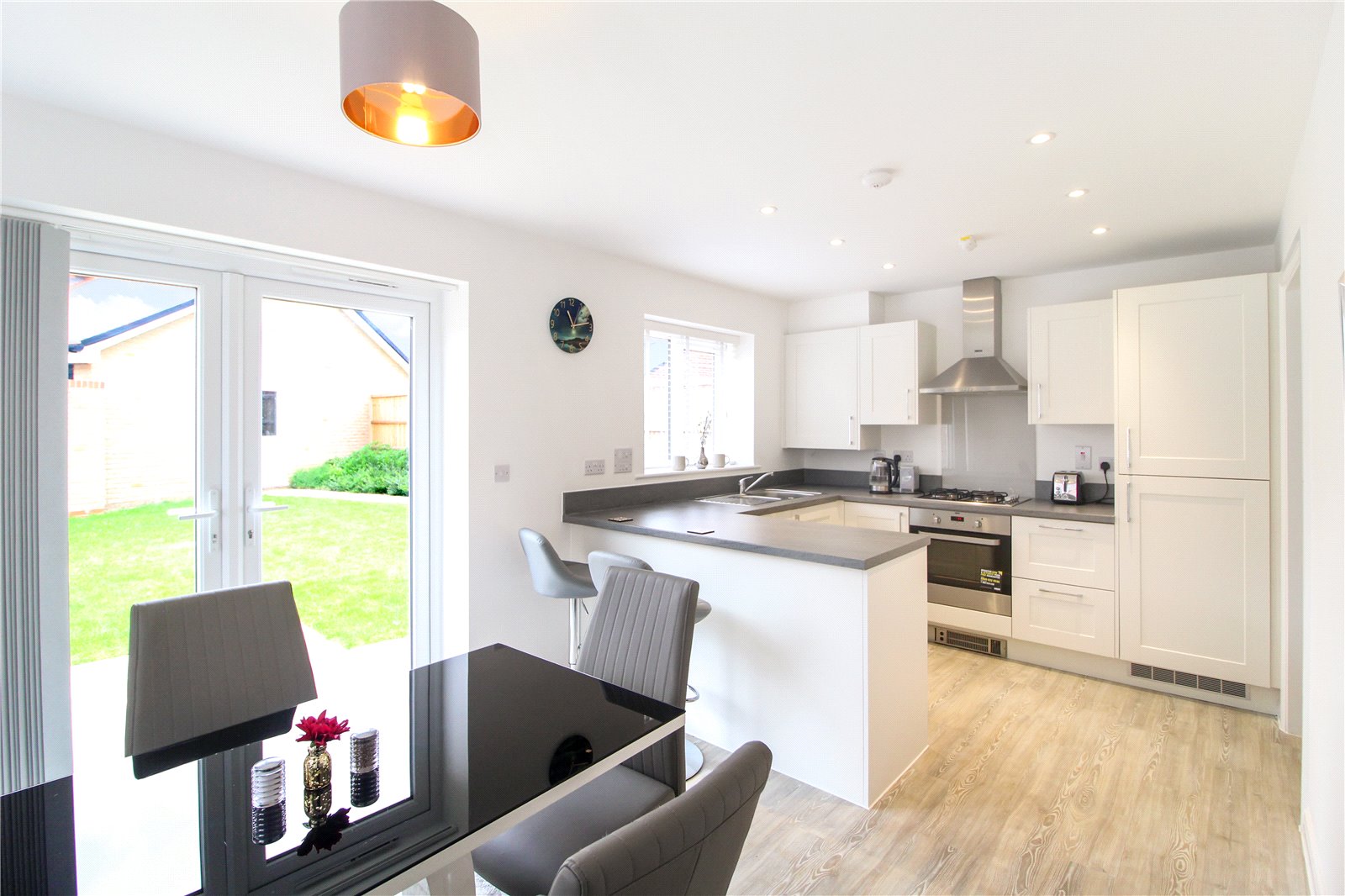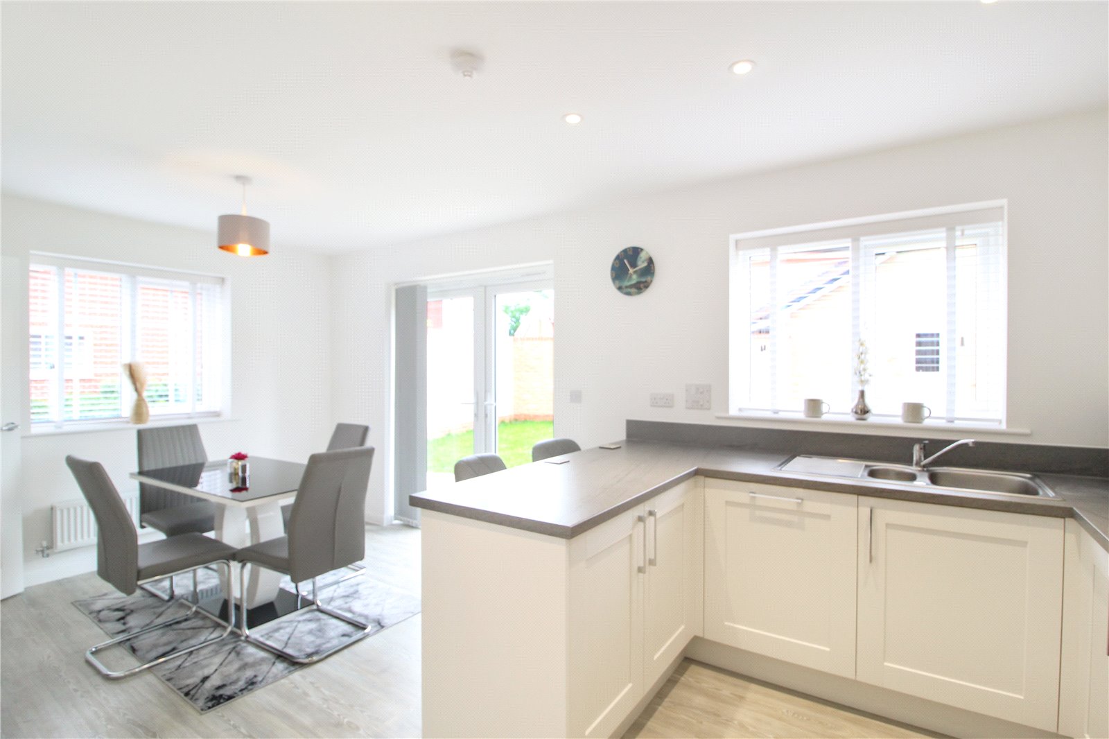 Large kitchen diner with wooden floors, UPVC double glazed doors leading into the garden and double glazed windows to side aspect. Space for table and seating, eye and base level units with fitted sink, oven and integrated fridge freezer. Smooth walls and ceiling with spotlights, doorway leading to: