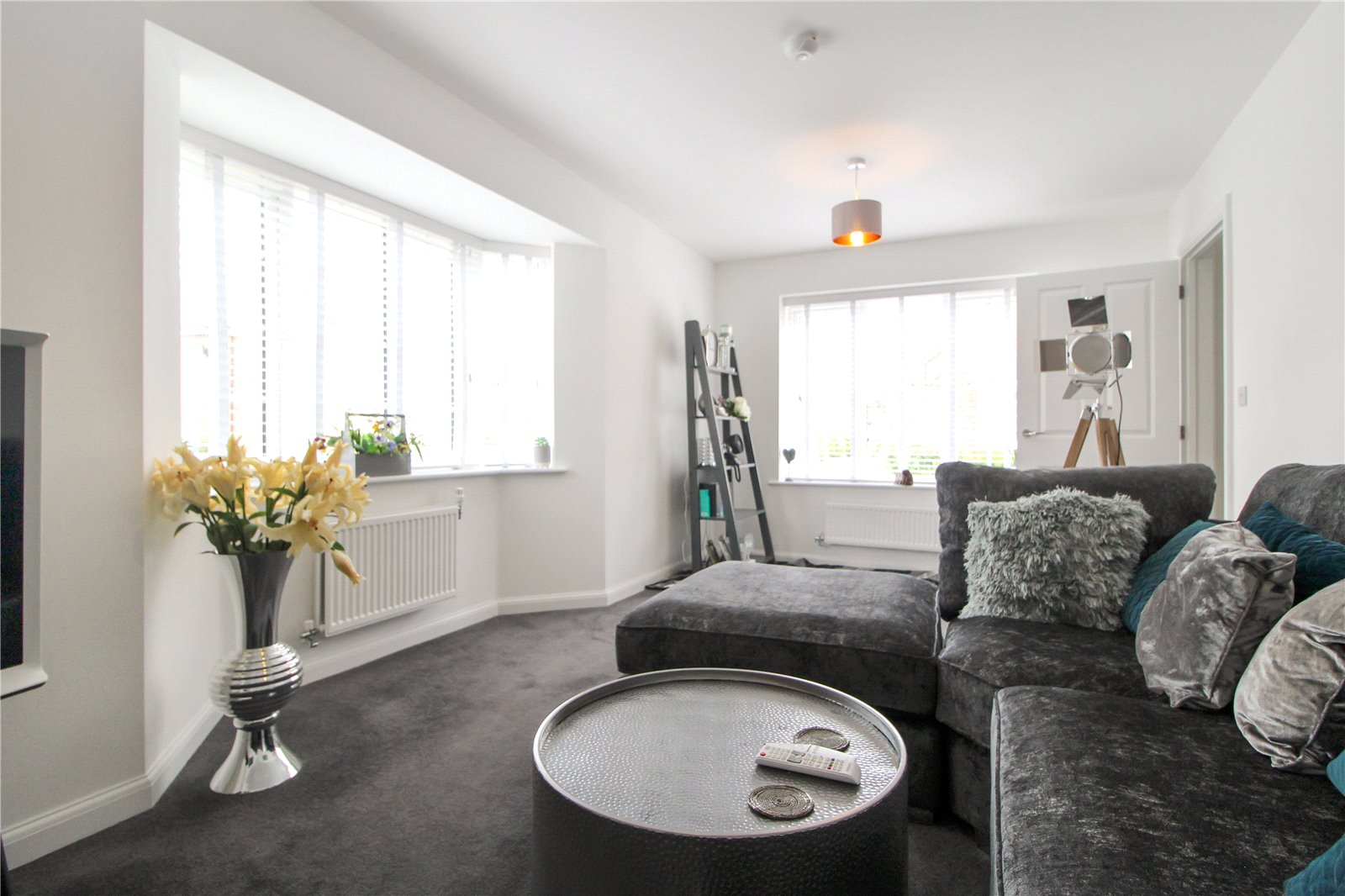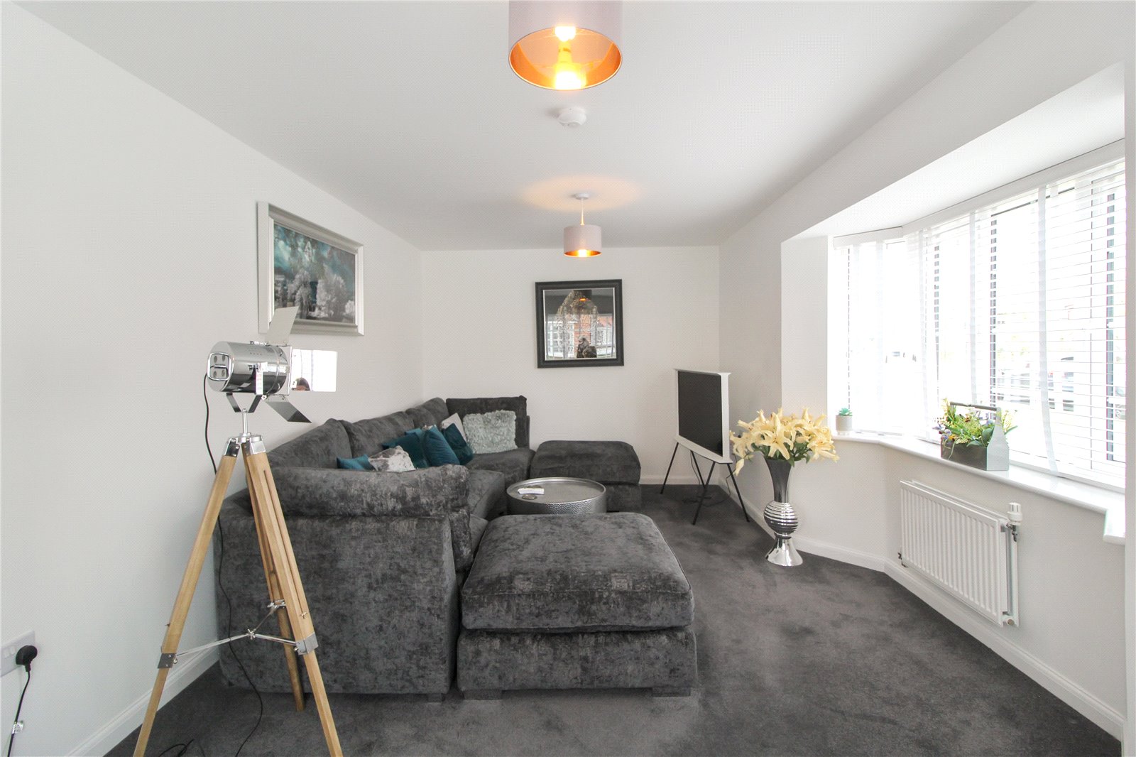 Spacious living room with UPVC double glazed bay window to side aspect, carpeted flooring, radiator, smooth walls, and ceiling with double ceiling lights.