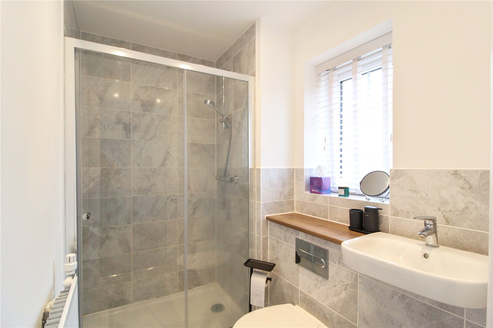 Three-piece ensuite to Bedroom 1 with shower, toilet, and sink. UPVC double glazed obscure window to front aspect.