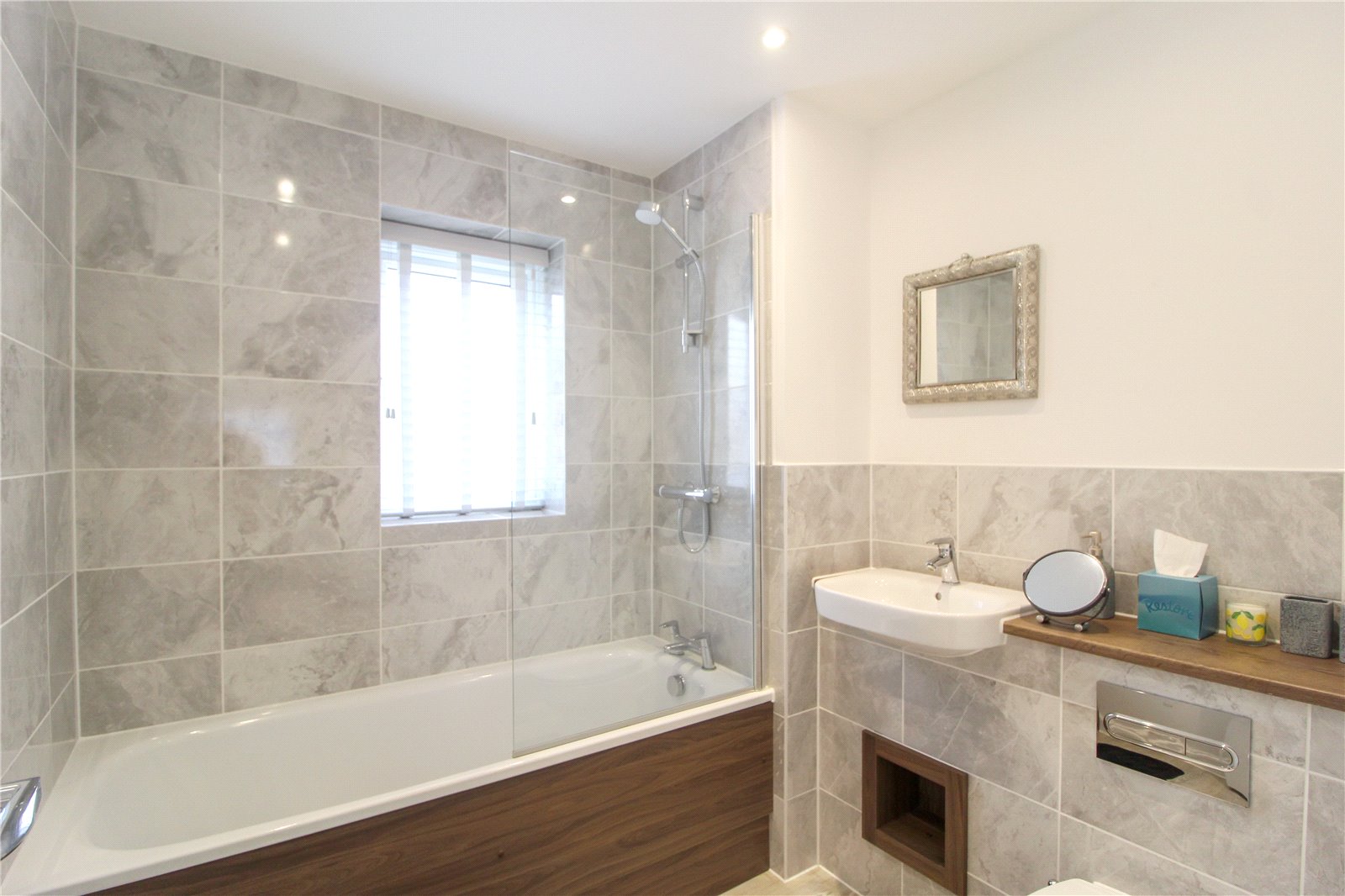 Stylish three-piece bathroom with bath, toilet, and sink. Tiled walls and spotlights fitted. Double glazed obscure window to side aspect