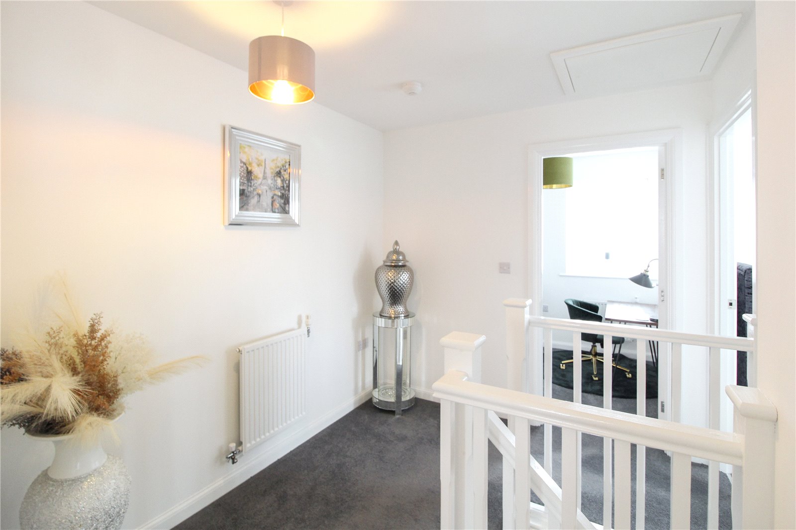 Good size landing with extra storage cupboard, carpeted flooring, smooth walls and ceilings with ceiling light and loft hatch