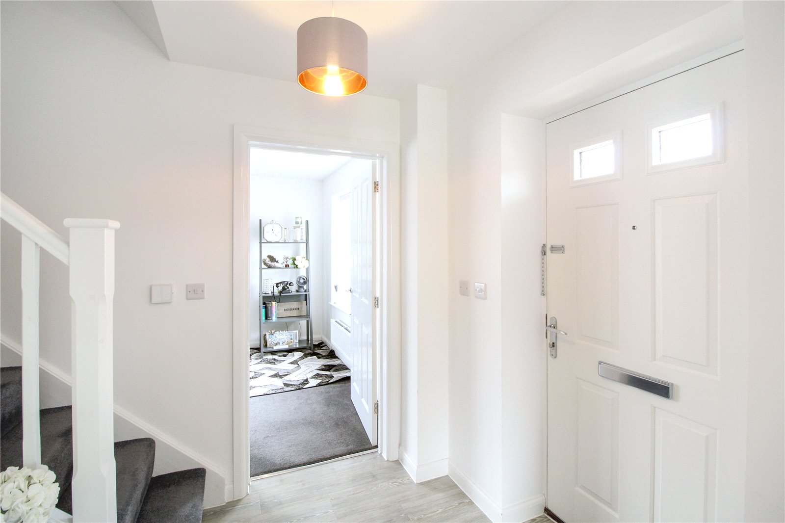 Step into a welcoming entrance hall with wooden flooring, smooth walls, and ceiling with ceiling light. Doors leading to: