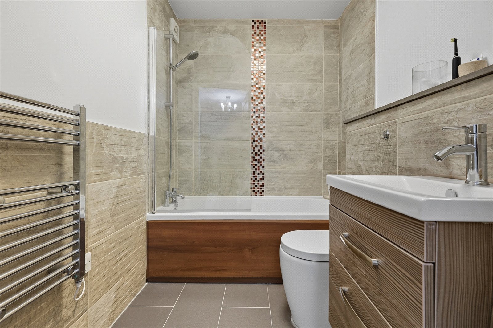 Fitted with a modern white three piece suite comprising vanity wash hand basin with drawers under and stainless steel mixer tap, low level WC with concealed cistern, panelled enclosed bath with stainless steel mixer tap and wall mounted shower attachment plus shower screen. Extractor fan. Tiling to walls with mosaic strip tiling. Smooth plastered ceiling. Ceramic tiled floor. Heated towel rail.