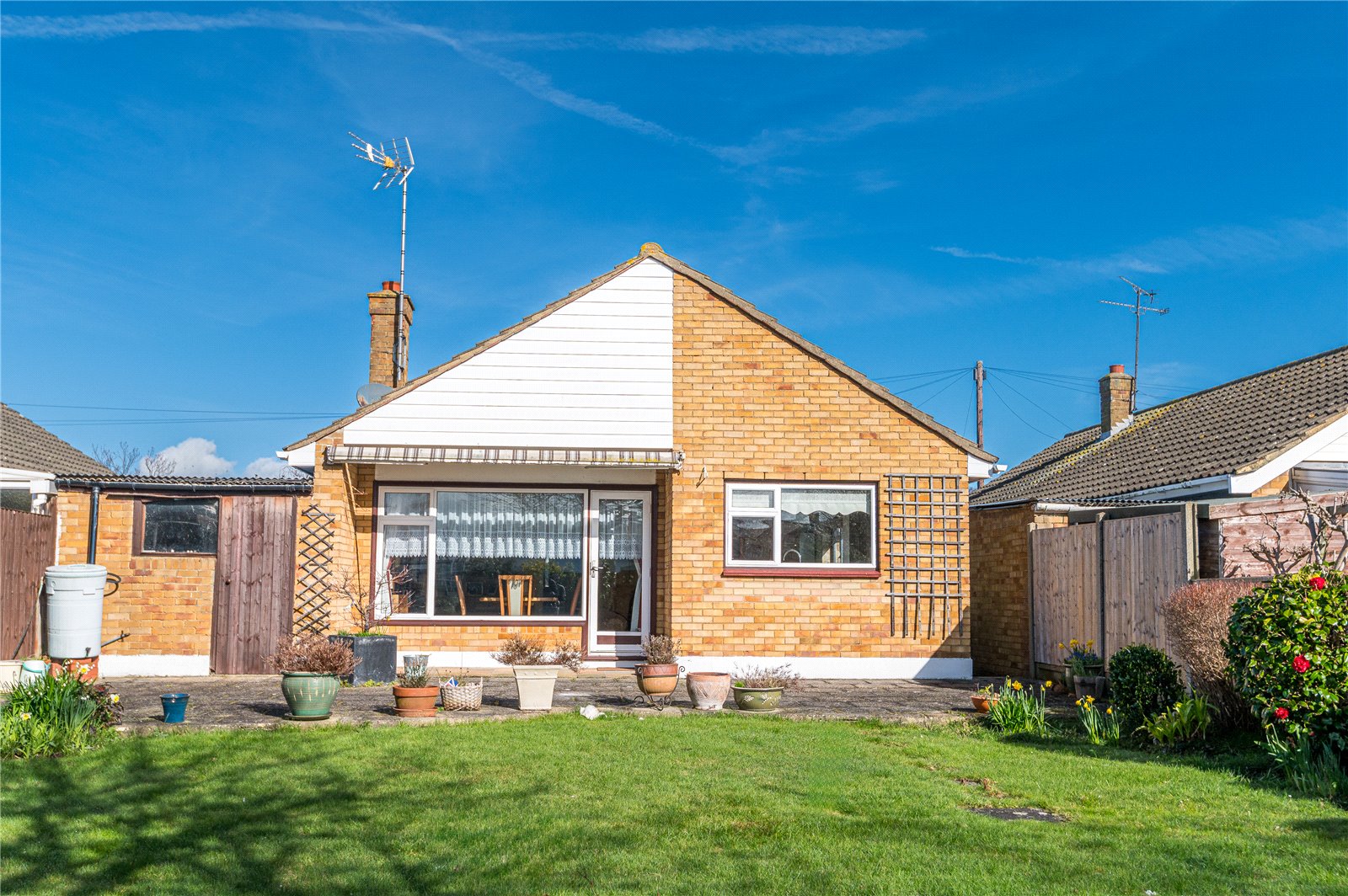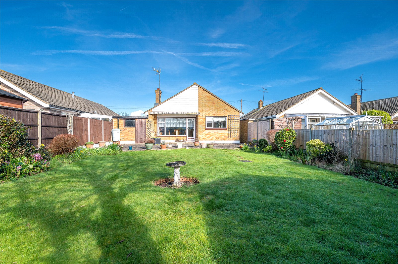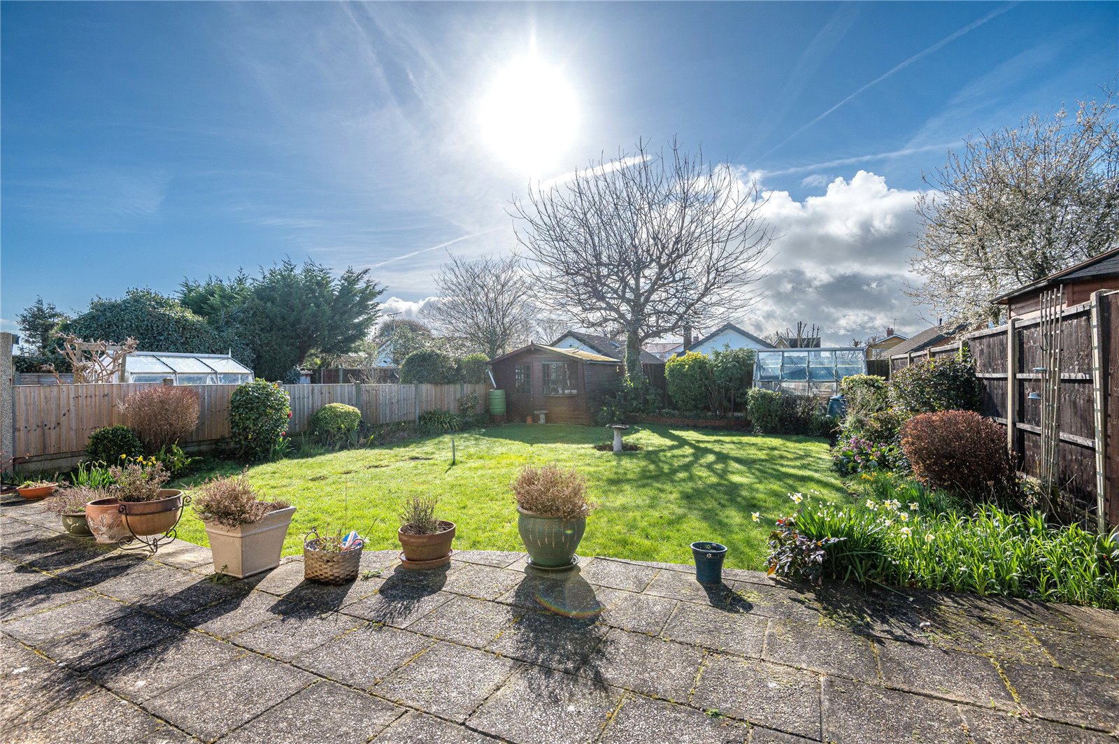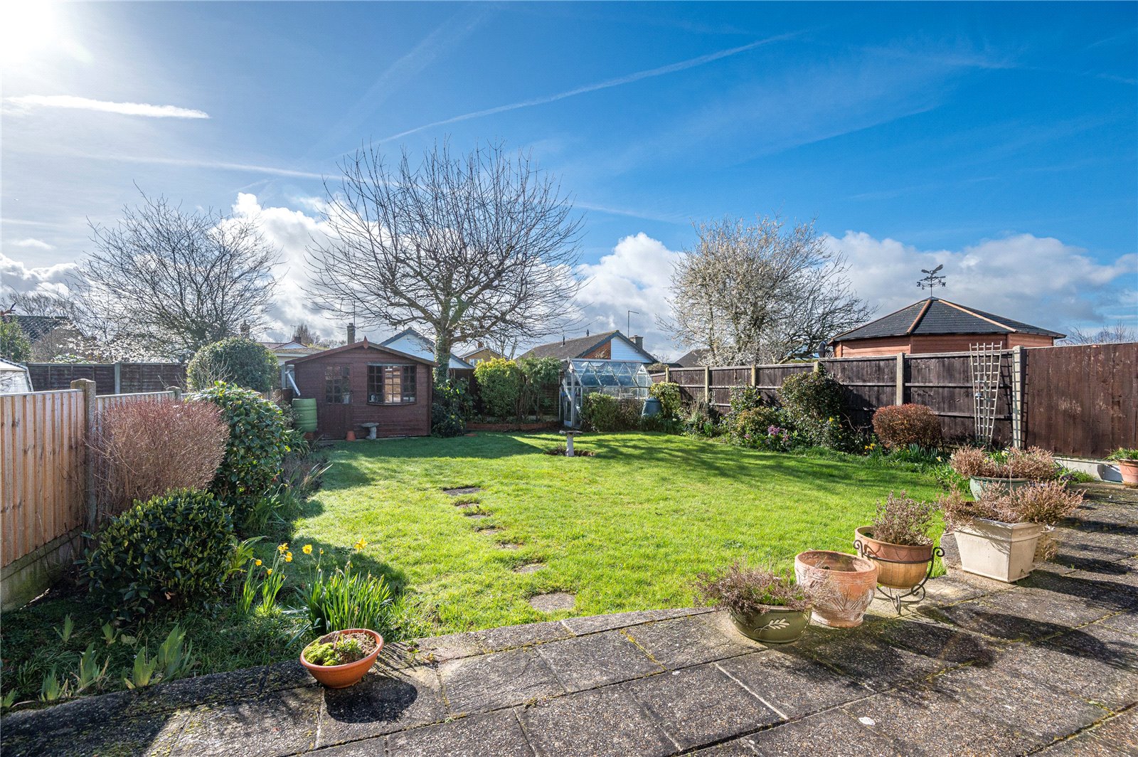 The property benefits from a good sized South backing rear garden which is unoverlooked and mainly laid to lawn. Planted borders. Maturing trees and shrubs. Extensive paved patio area. Timber garden shed. Aluminium framed greenhouse. Sun awning. Cold water tap. Side entrance.