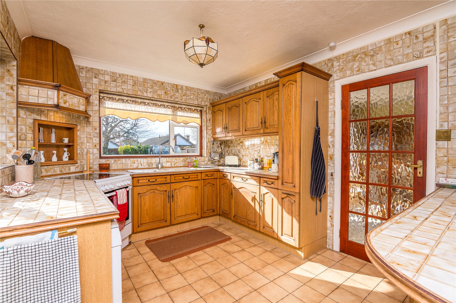 This room enjoys a dual aspect with double glazed windows to side and rear overlooking the garden with double glazed door to side giving access to front and rear. Fitted with a wide range of natural wood fronted units and tiled work surfaces with inset sink unit with a range of cupboards and drawers below. Cooker space. Recess space and plumbing for dishwasher. Built-in refridgerator with decor panel. Retractable larder cupboard. Further matching work surface/dresser style unit with leaded-lite china display cabinet. Cupboards below. Small breakfast bar. Wall mounted storage cabinets with lighting below. Radiator. Tiled walls and floor. Archway leading through to;