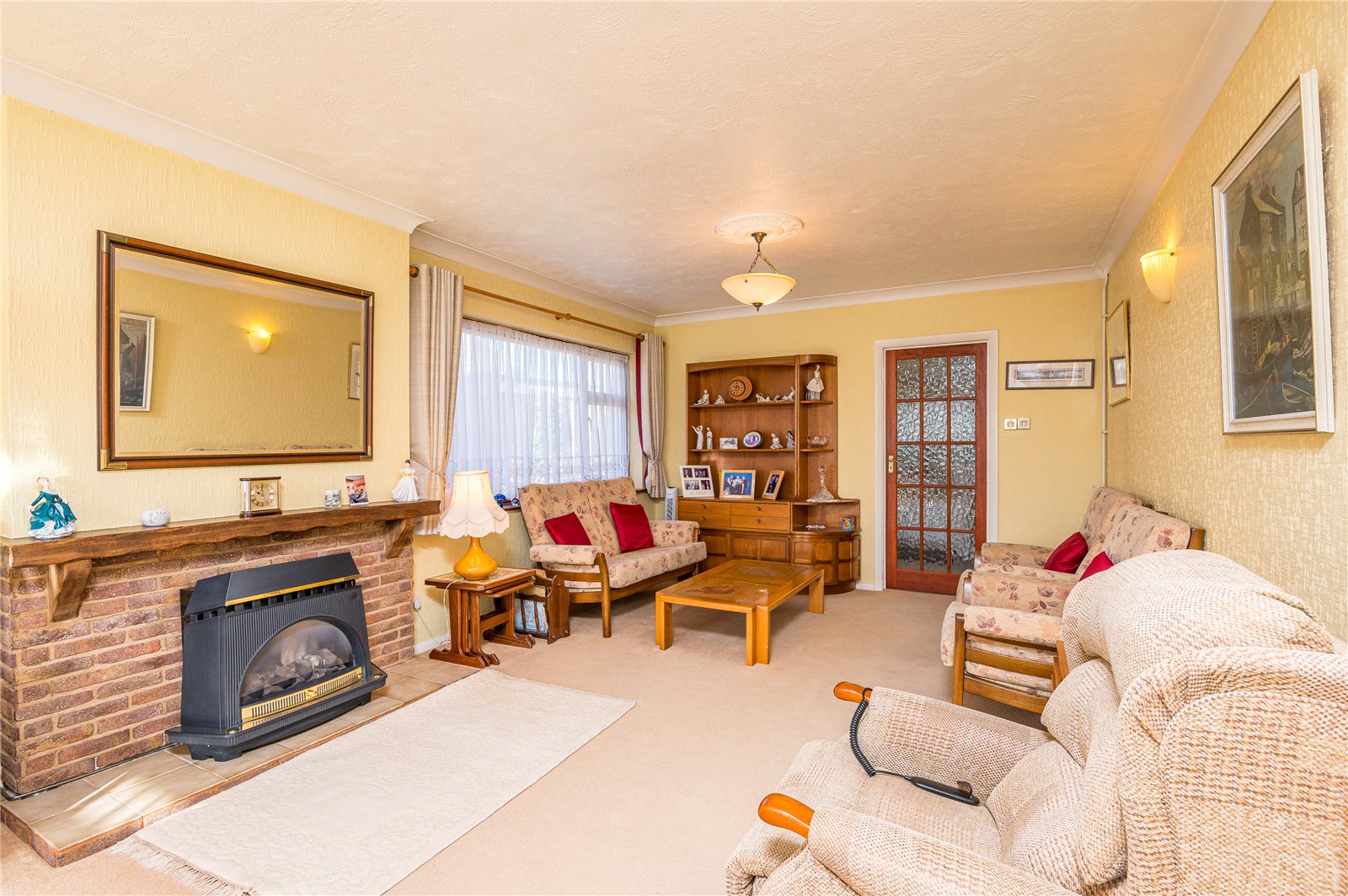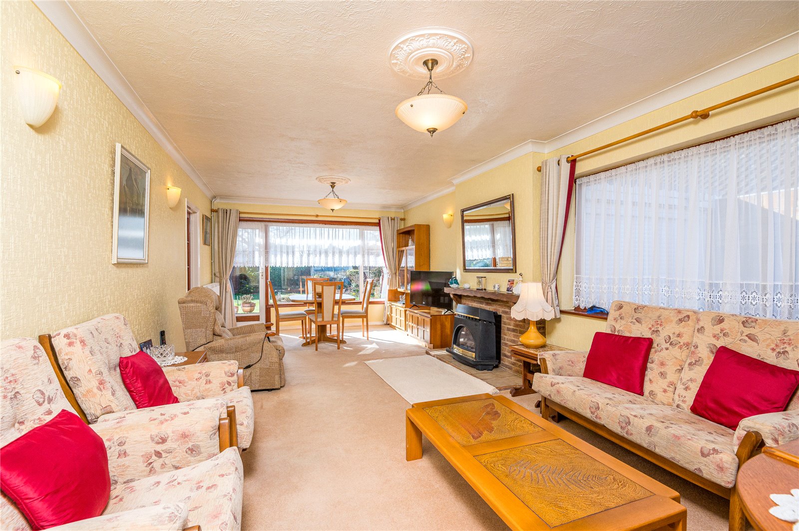 This bright and spacious living room enjoys a dual aspect with large double glazed window to side and almost full width double glazed window and french door framing lovely views across the rear garden. Two radiators. Attractive brick work fireplace with coal effect gas fire, tiled hearth and timber mantle. Coved ceiling. Door to;
