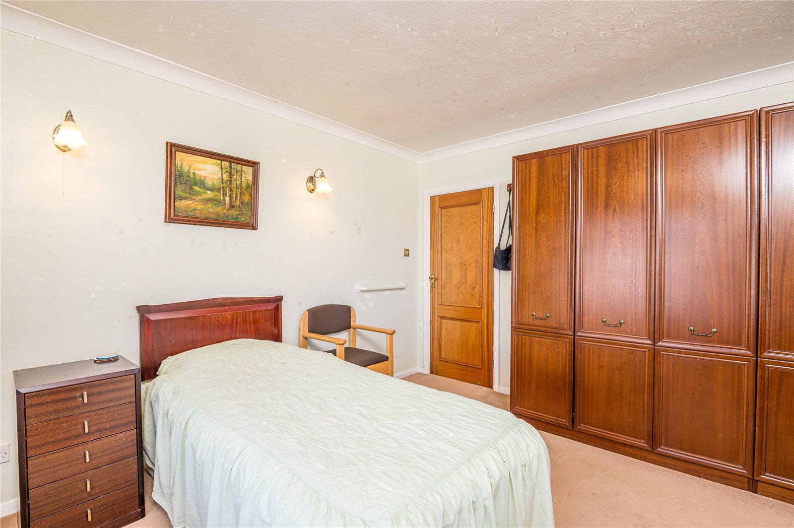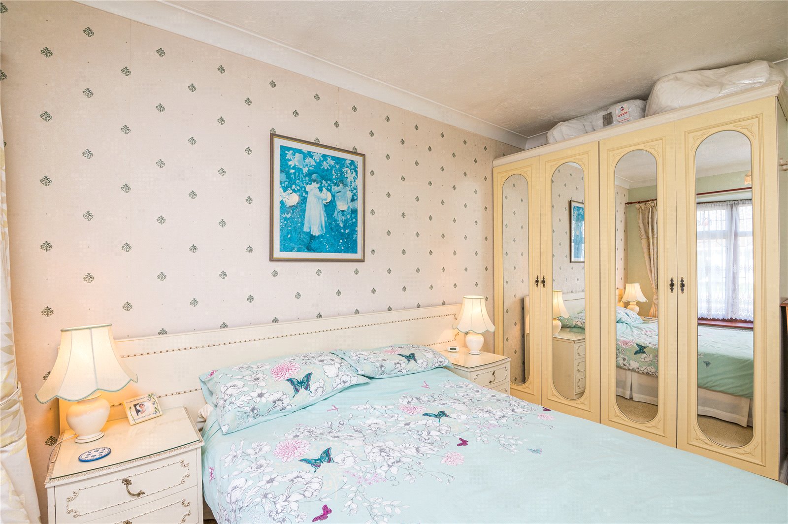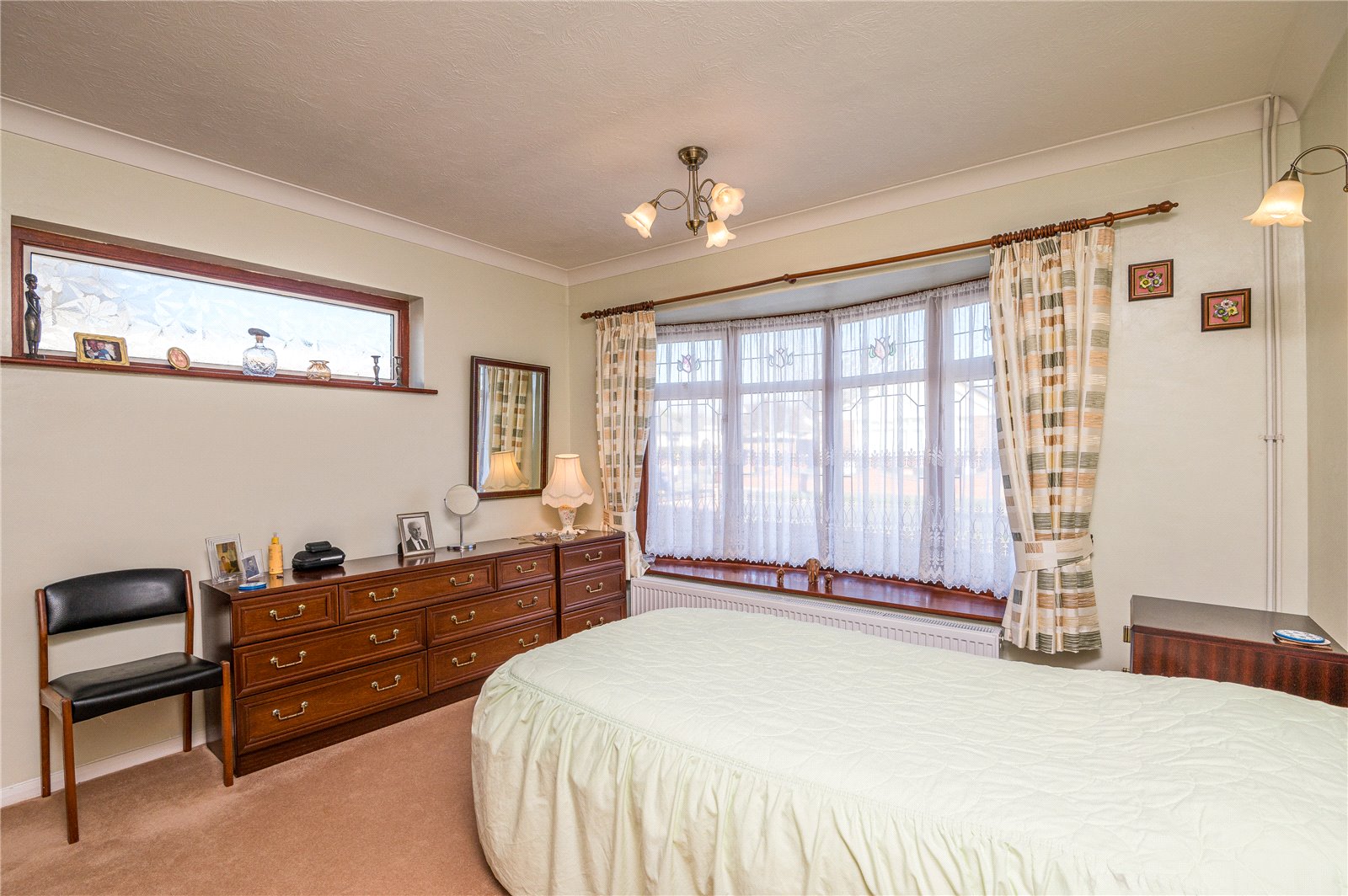 This bright double bedroom has a wide double glazed Oriel bay window to front. Range of wardrobe cupboards. Radiator. Coved ceiling.