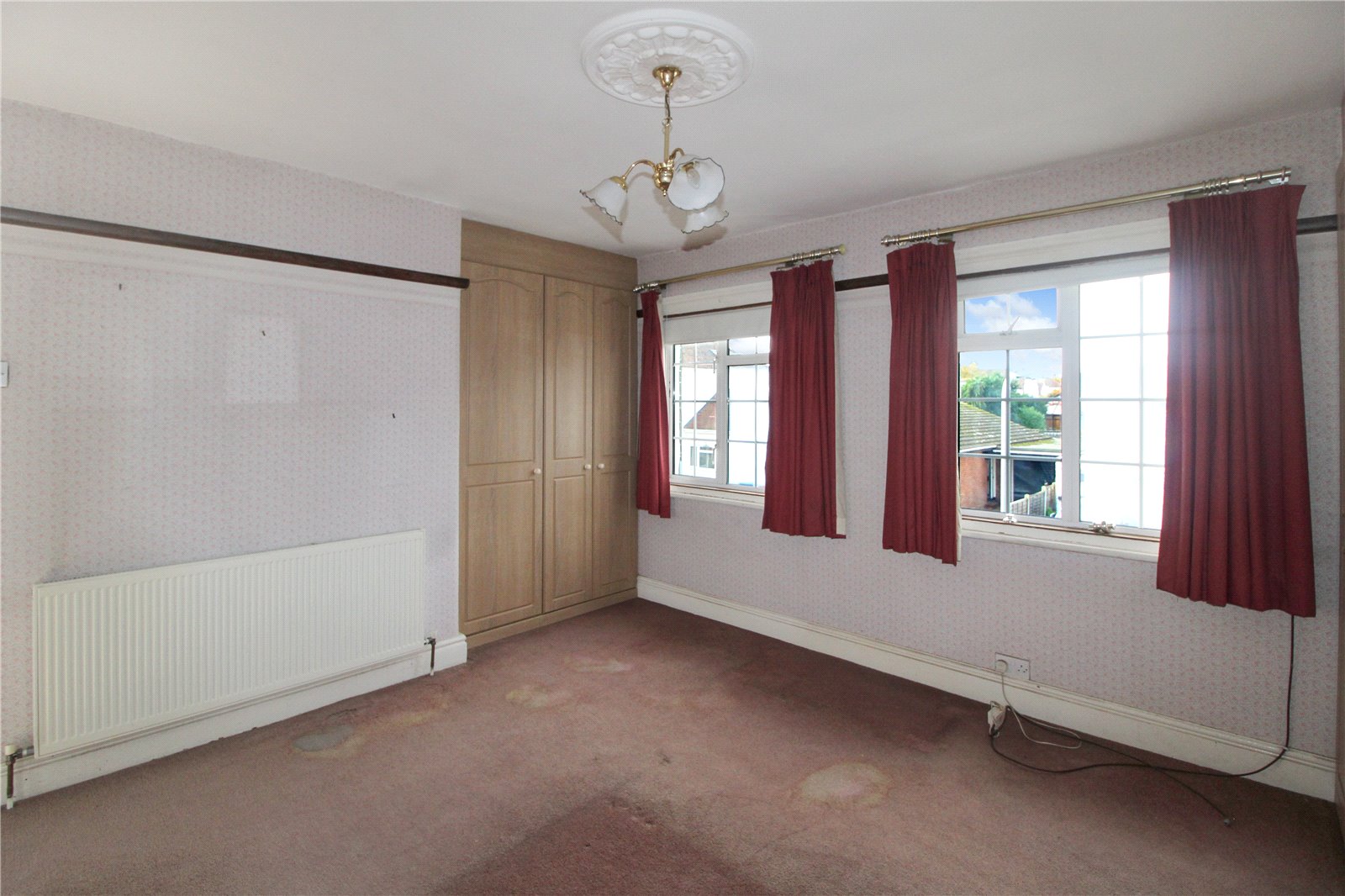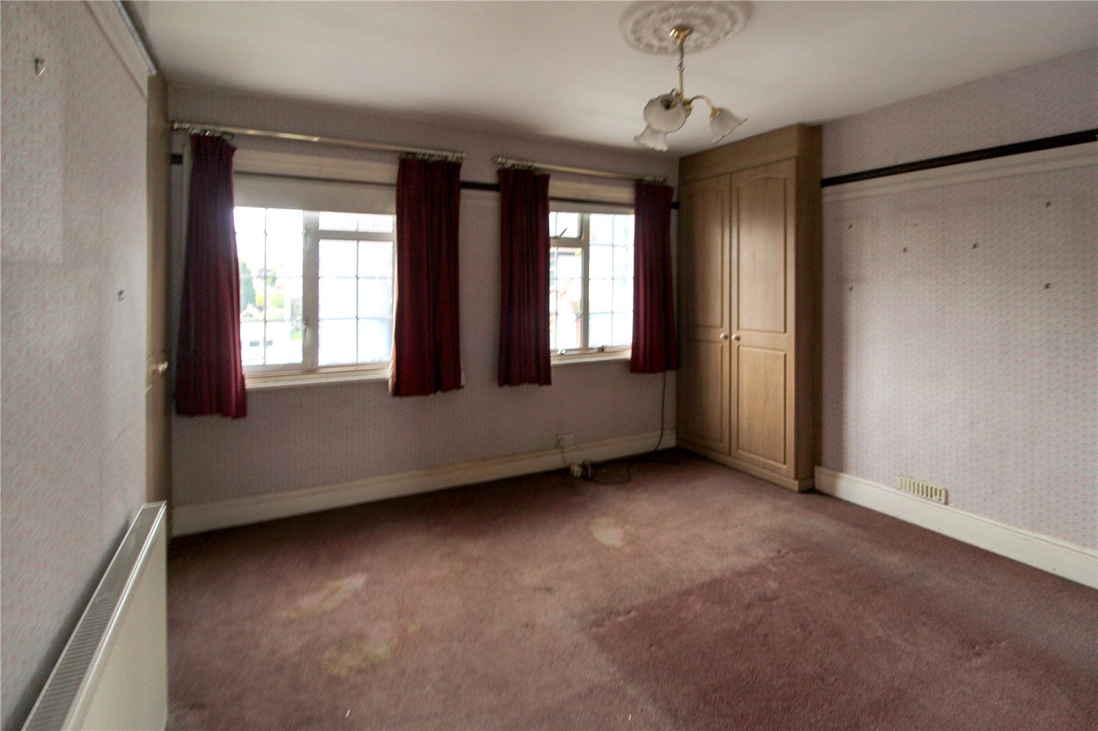 Large double bedroom with two double glazed windows to front aspect. carpet to floor, radiator, fitted wardrobes, ceiling light.