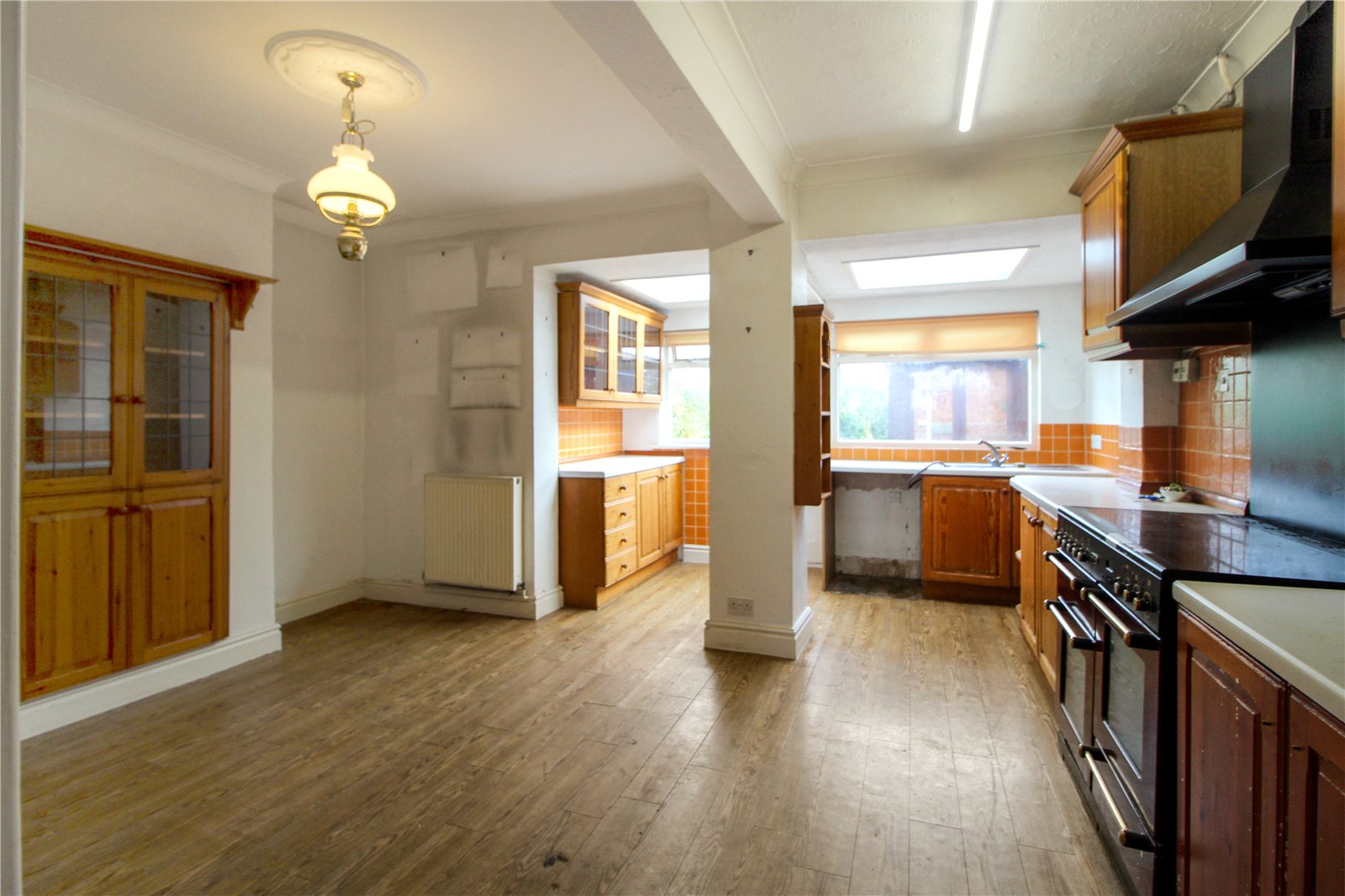 Door to rear into garden with windows adjacent. Fitted with a worksurface incorporating stainless steel sink and drainer unit. A further worksurface with five ring electric induction rangemaster and extractor hood above with a range of base and eye level cabinets housing Glo-Worm combination boiler. Tiled Splashbacks. Laminate wood effect flooring. Skylights. Ceiling lights.