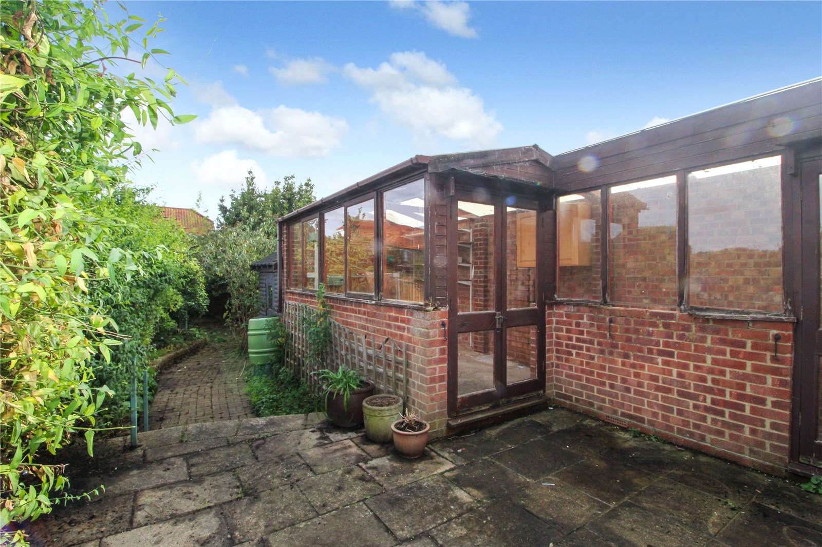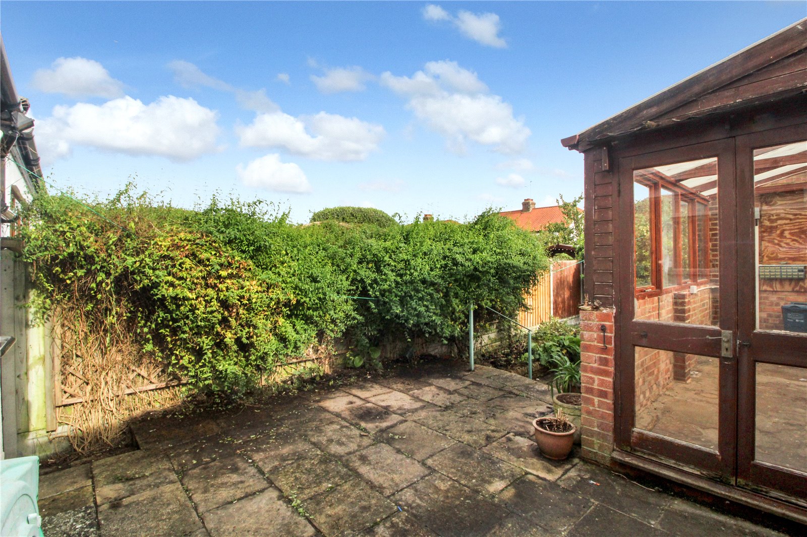 Good size rear garden, mostly paved, with some shrubs and bushes surrounding.