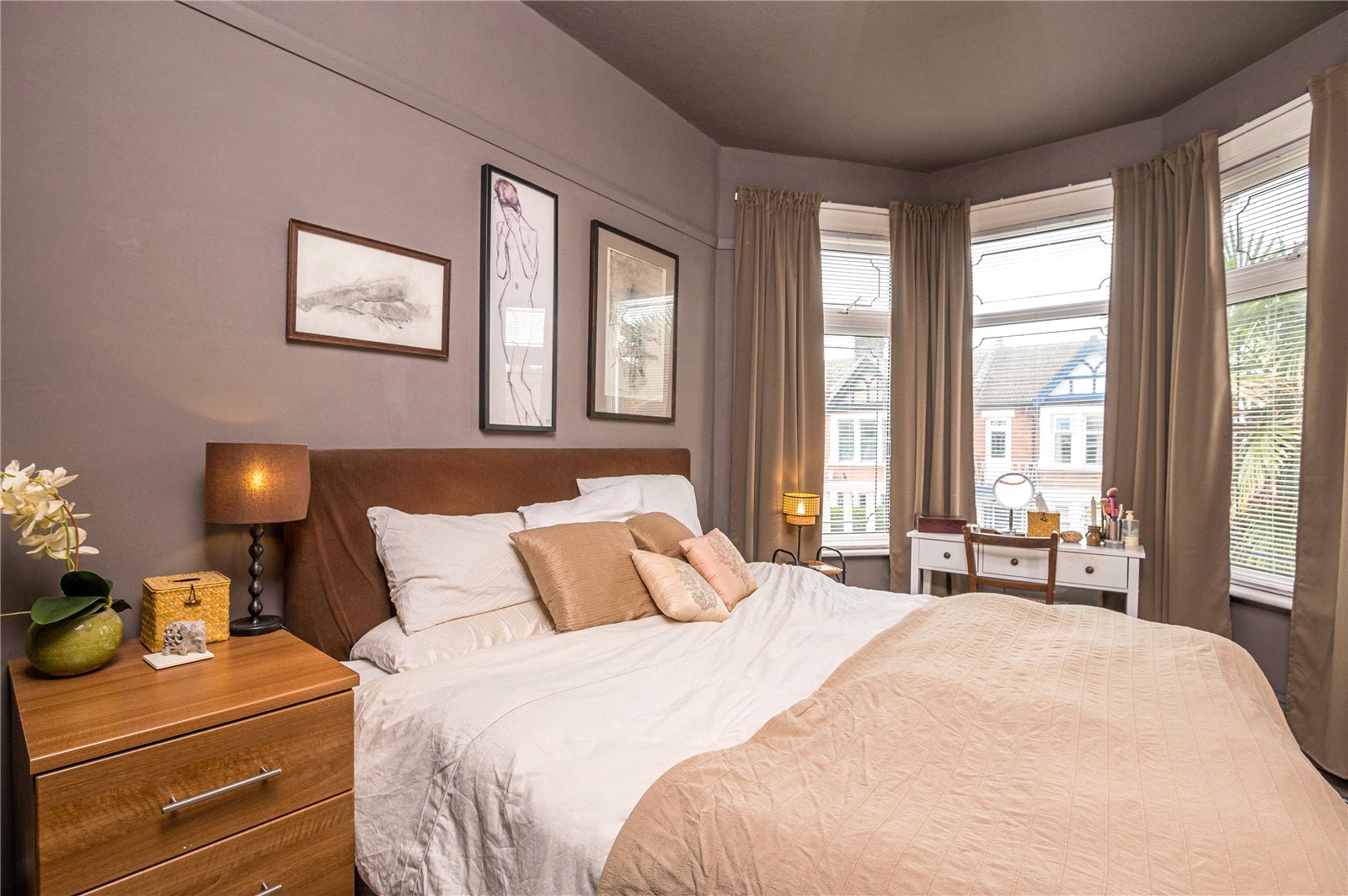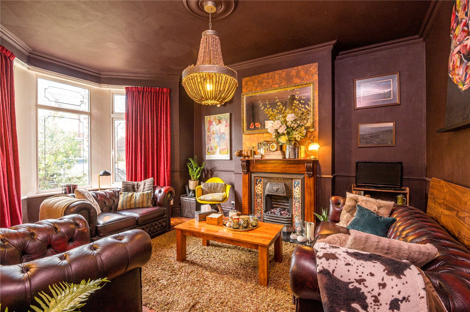 into bay. Large UPVC double glazed window to front. Wall mounted radiator. Original feature fireplace with stone hearth, wooden mantle and inset cast iron fire with tiled inserts. Parquet flooring throughout. High level skirting. Feature dado rail. Coved cornice to ceiling with feature ceiling rose.