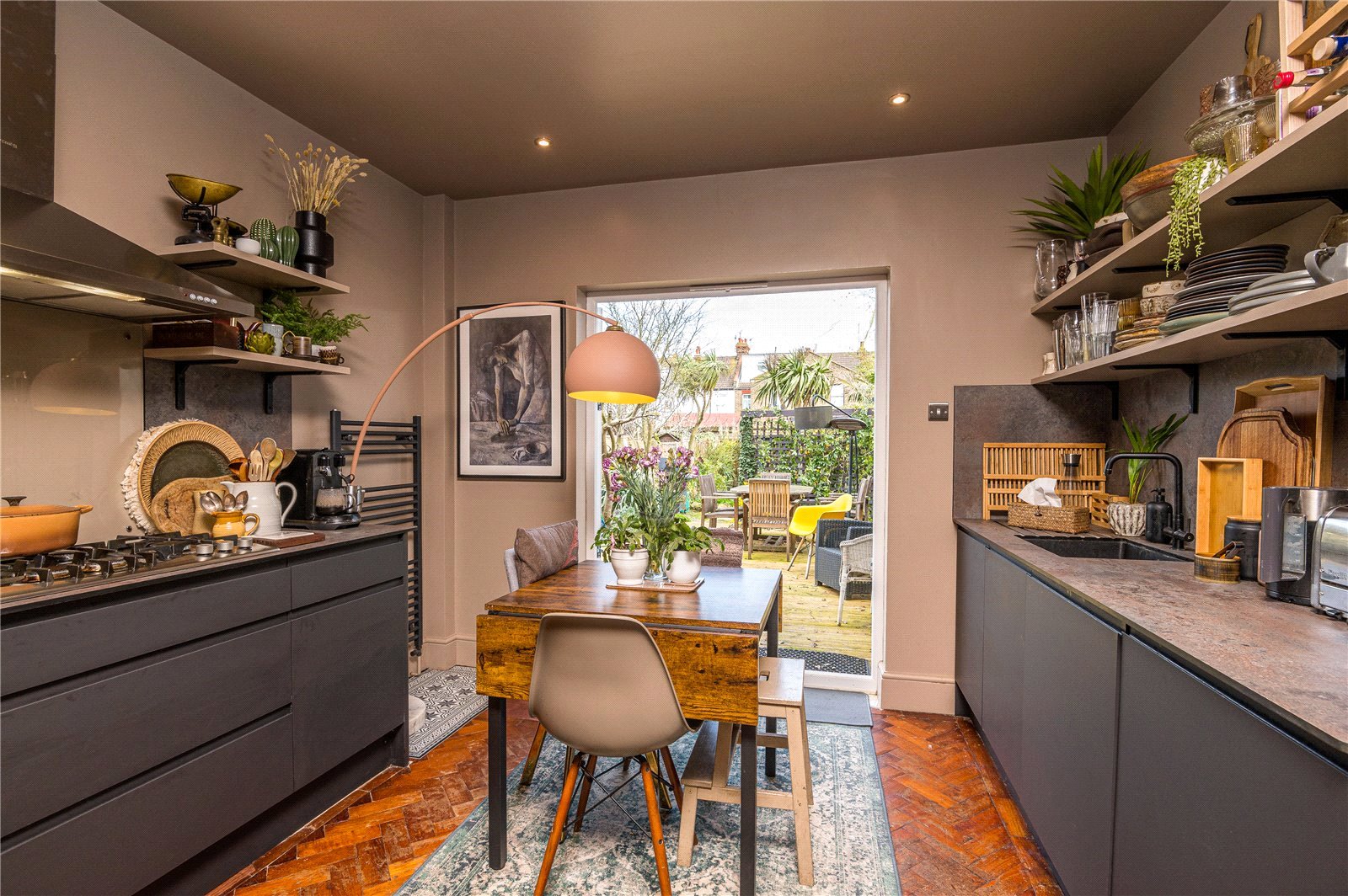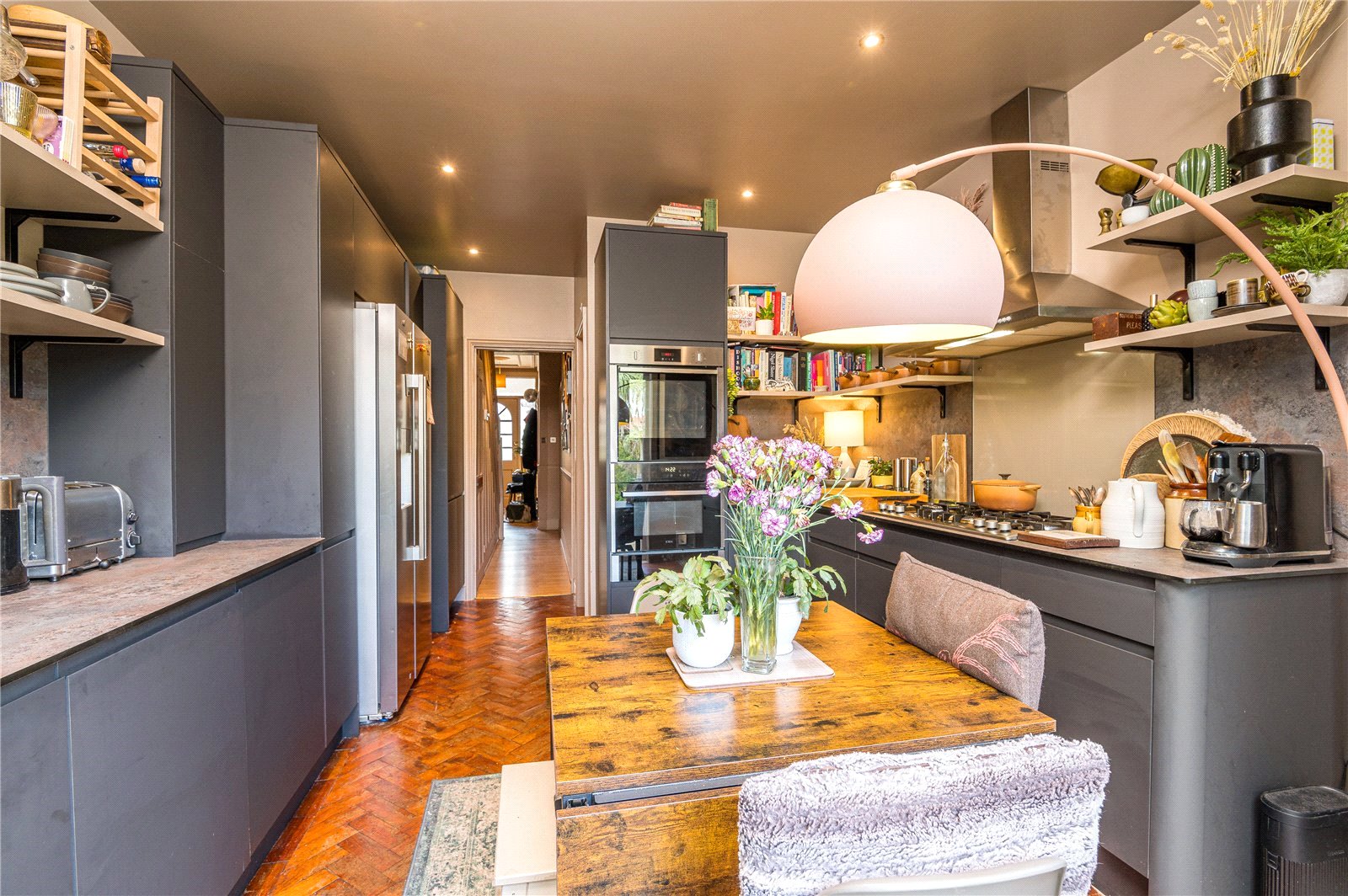 Maximum. UPVC double glazed French door to rear leading on to rear garden. Kitchen is fitted with a modern and contemporary range of base and eye level cabinets incorporating a slim line square edged working surface with matching splash back. Inset composite sink with mixer tap and drainer unit. Inset six burner gas hob with canopy extractor hood above. Integrated Neff double oven with drawer beneath. Space for American style fridge/freezer. Range of full height cabinets. Wall mounted heated towel rail. Utility room housing washing machine and tumble dryer. Integrated dishwasher. Original Parquet flooring. Smooth plastered ceiling with recessed LED lighting.
