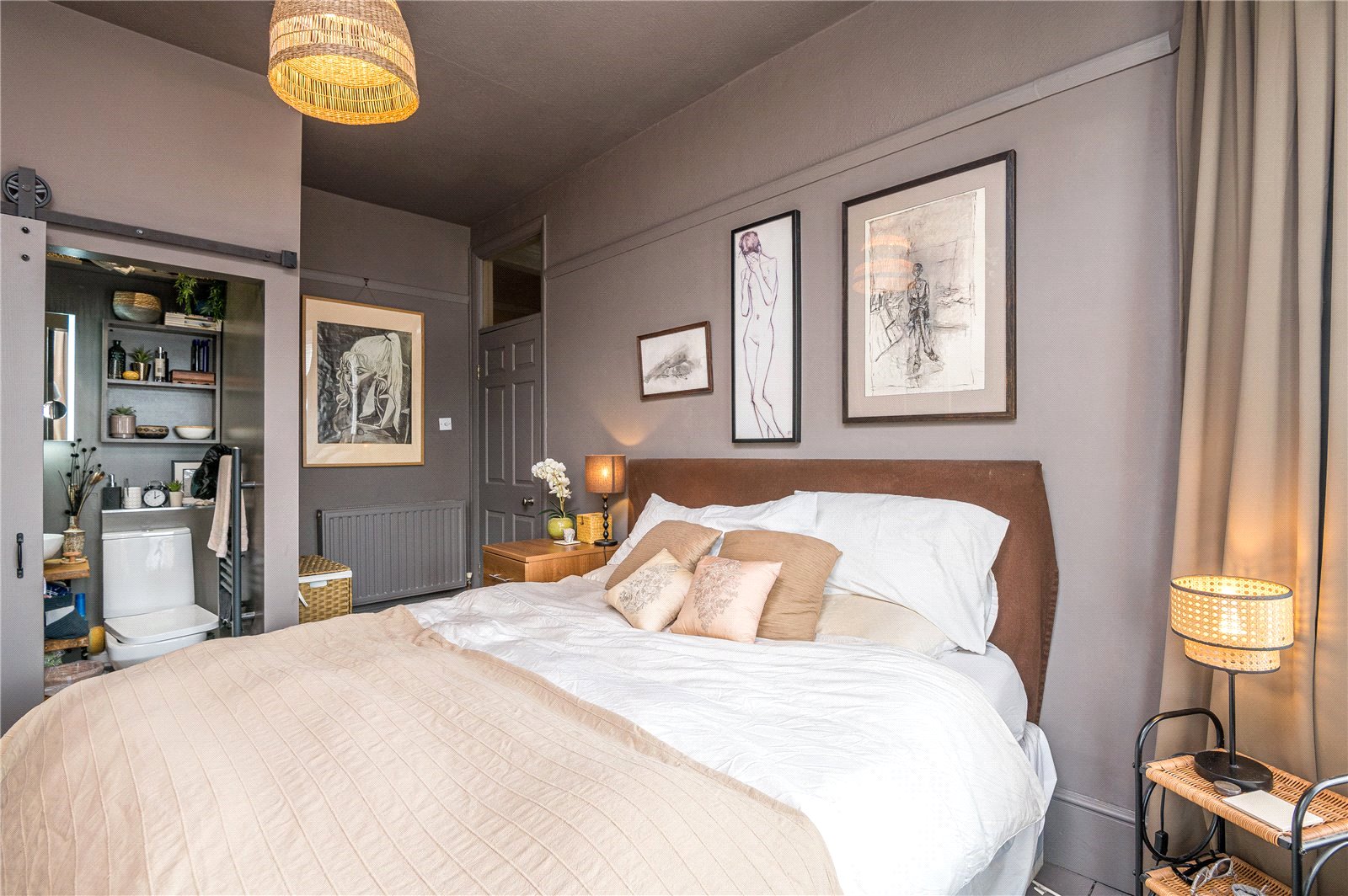 Fitted with a modern and contemporary three piece suite comprising low flush WC. Countertop mounted wash hand basin with mixer tap and storage beneath. Enclosed shower cubicle with rainfall shower attachment. Wall mounted mixer tap. Separate adjustable showerhead. Glass sliding door. Contemporary heated towel rail. Exposed wooden flooring. High level skirting. Part tiled walls. Wall mounted vanity mirror with storage behind.