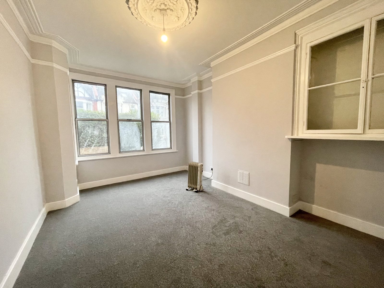 Large half bay window to front with alluminium sash windows. Feature fireplace with tiled mantle and hearth, open grate. Wall mounted radiator. High level skirting. Fitted display cabinet to alcove. Feature picture rail. Decorative coved cornice to smooth plastered ceiling with ceiling rose.