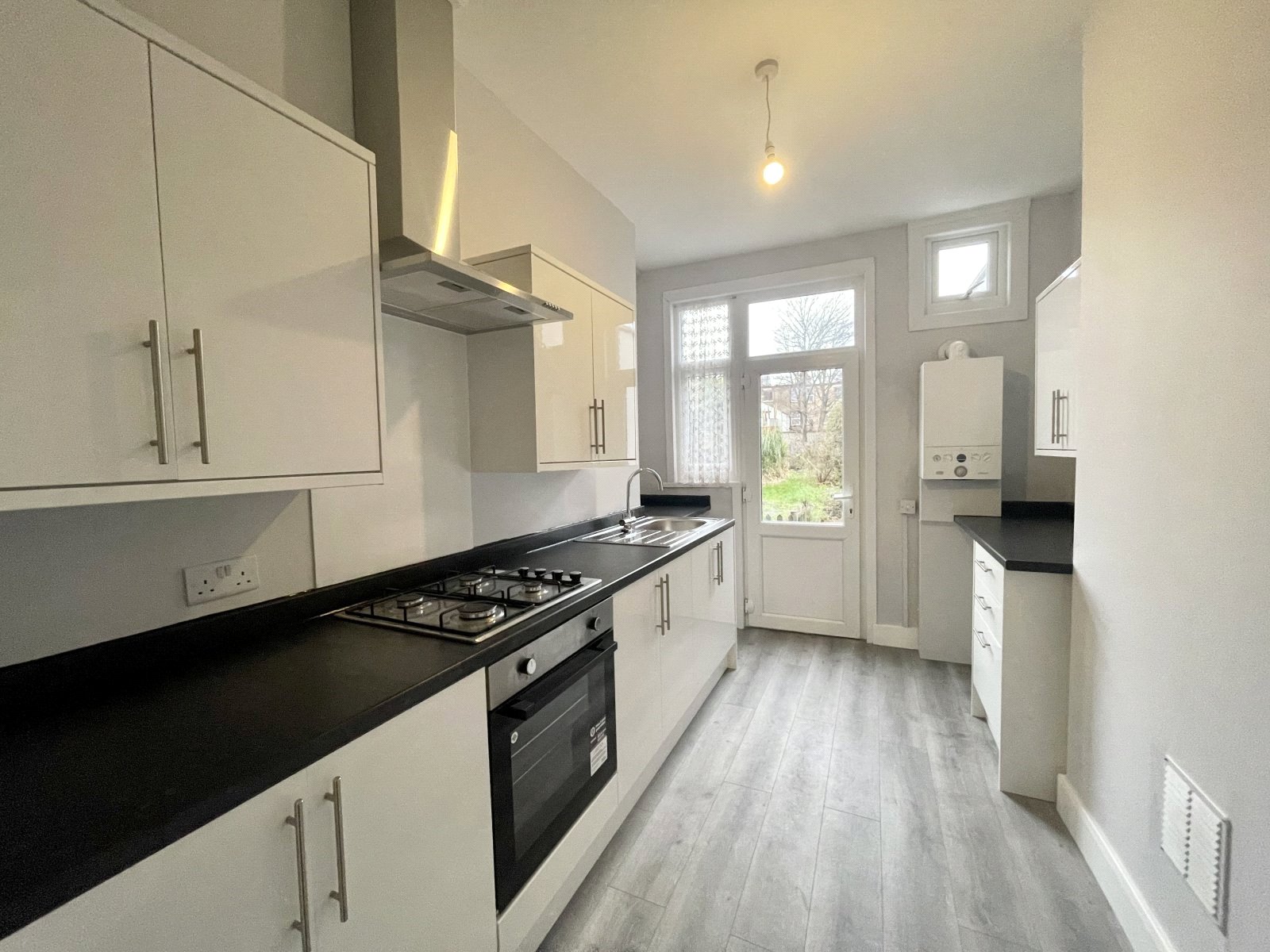 Kitchen is fitted with a modern and contemporary range of eye and base level cabinets incorporating rolled edge work surfaces, inset stainless steel sink with mixer tap and drainer unit. Space for free standing fridge/freezer. Space for under counter dishwasher/washing machine. integrated fan assist electric oven. UPVC double glazed door to rear with UPVC double glazed window to side and above,. Further UPVC double glazed fan light window to rear. Wall mounted Ideal gas fired combination boiler. Wood effect vinyl flooring. High level skirting. Feature picture rail. Smooth plastered ceiling. Tiled splashbacks.