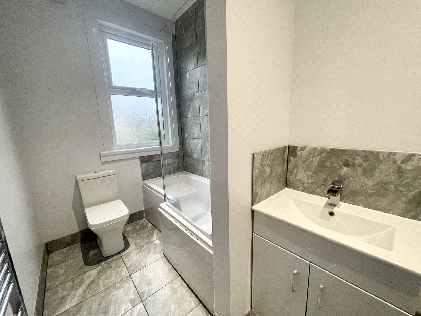 UPVC double glazed obscured window to rear. Bathroom is fitted with a three piece suite comprising low flush WC, wash hand basin and panel bath with overhead shower attachment and mixer tap. Part tiled walls. tiled floors. Radiator.